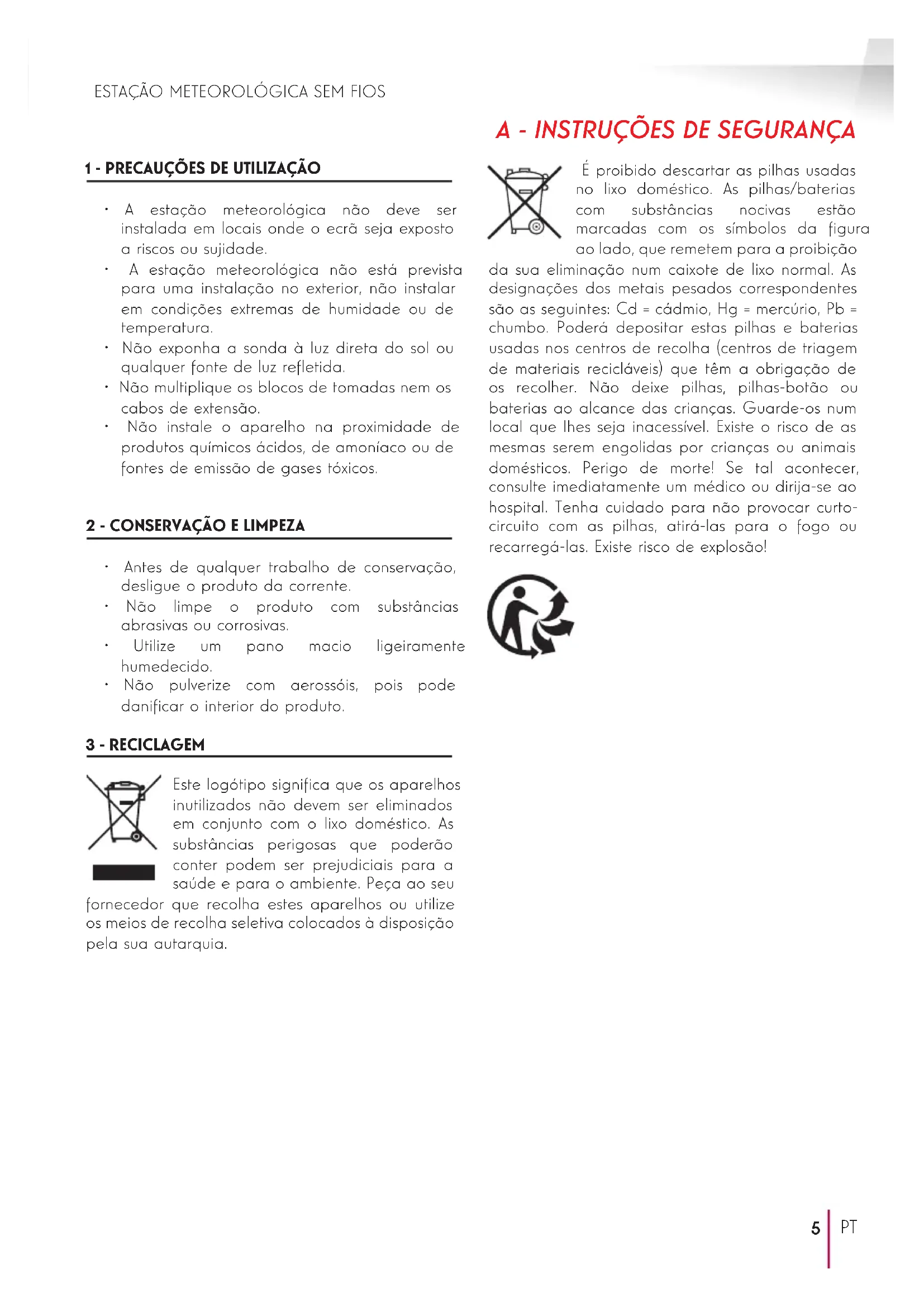 Este logótipo signica que os aparelhos inutilizados não devem ser eliminados em conjunto com o lixo doméstico. As substâncias perigosas que poderão conter podem ser prejudiciais para a saúde e para o ambiente. Peça ao seu fornecedor que recolha estes aparelhos ou utilize os meios de recolha seletiva colocados à disposição pela sua autarquia. É proibido descartar as pilhas usadas no lixo doméstico. As pilhas/baterias com substâncias nocivas estão marcadas com os símbolos da gura ao lado, que remetem para a proibição da sua eliminação num caixote de lixo normal. As designações dos metais pesados correspondentes são as seguintes: Cd = cádmio, Hg = mercúrio, Pb = chumbo. Poderá depositar estas pilhas e baterias usadas nos centros de recolha (centros de triagem de materiais recicláveis) que têm a obrigação de os recolher. Não deixe pilhas, pilhas-botão ou baterias ao alcance das crianças. Guarde-os num local que lhes seja inacessível. Existe o risco de as mesmas serem engolidas por crianças ou animais domésticos. Perigo de morte! Se tal acontecer, consulte imediatamente um médico ou dirija-se ao hospital. Tenha cuidado para não provocar curto- circuito com as pilhas, atirá-las para o fogo ou recarregá-las. Existe risco de explosão! Pour en savoir plus : www.quefairedemesdechets.frESTAÇÃO METEOROLÓGICA SEM FIOS