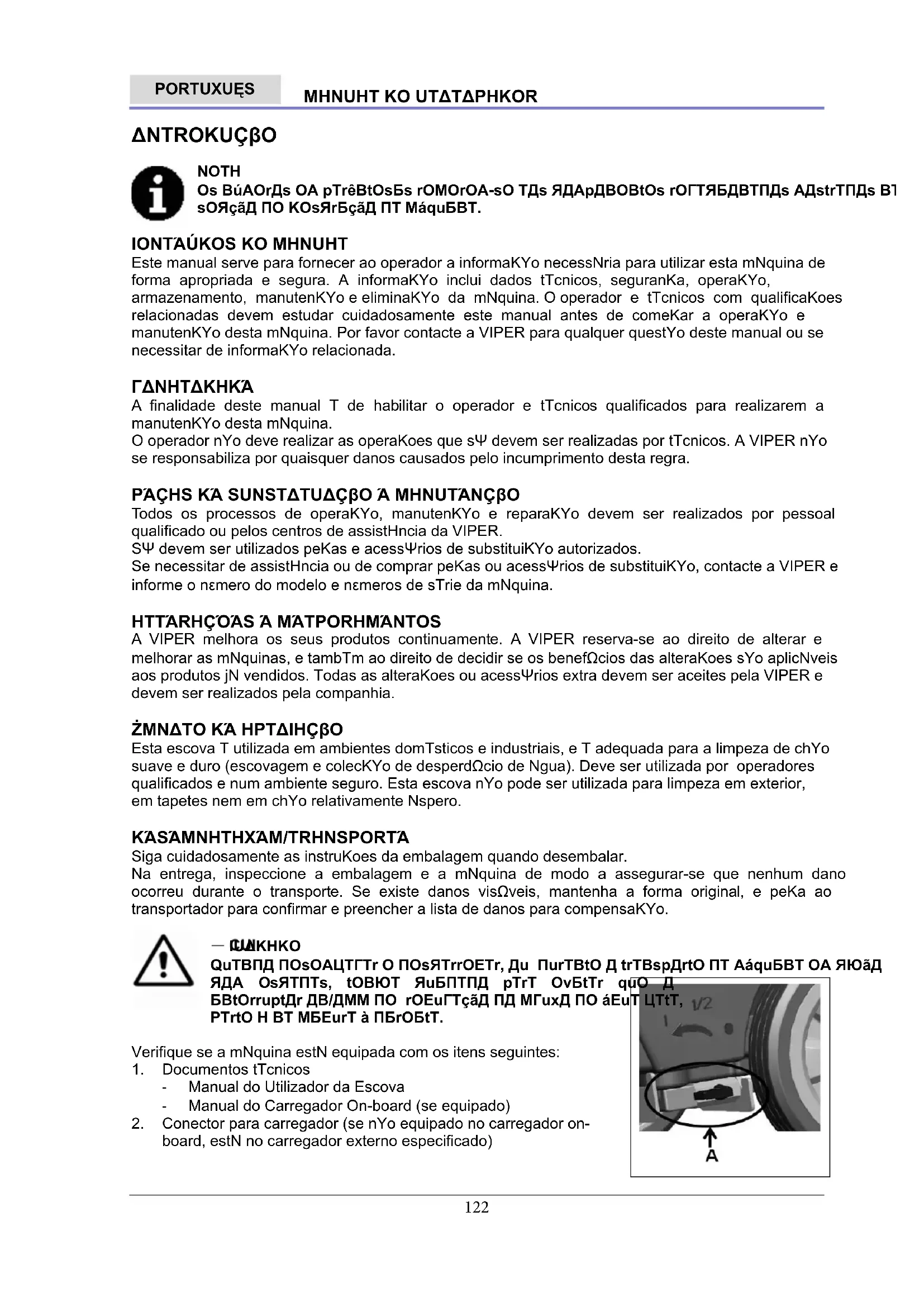 NOTA Se a máquina estiver instalada com o carregador on-board opcional, e quando o mesmo estiver com defeito, a máquina não pode ser operada. Se o carregador on-board estiver com defeito, contacte o centro de manutenção autorizado. Para mais informação, refira ao manual de manutenção (disponível em qualquer centro de manutenção da VIPER)