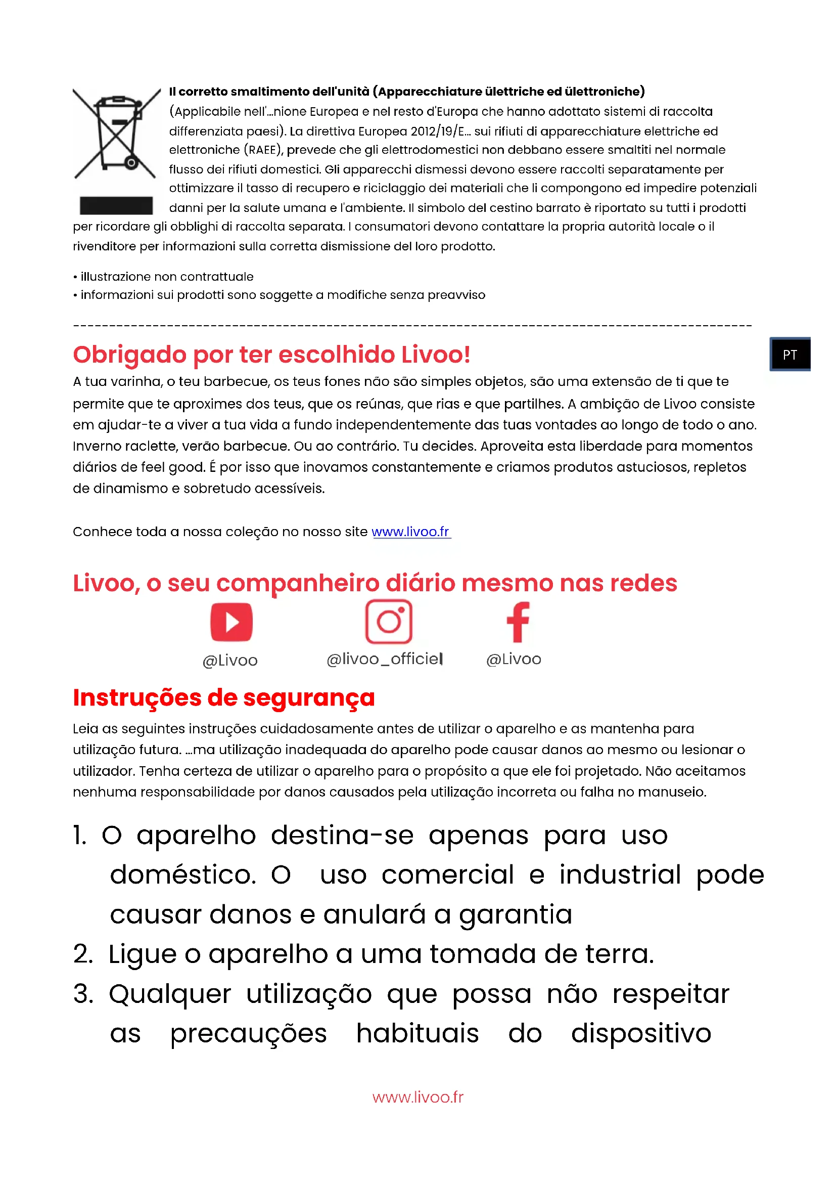 Obrigado por ter escolhido Livoo! A tua varinha, o teu barbecue, os teus fones não são simples objetos, são uma extensão de ti que te permite que te aproximes dos teus, que os reúnas, que rias e que partilhes. A ambição de Livoo consiste em ajudar-te a viver a tua vida a fundo independentemente das tuas vontades ao longo de todo o ano. Inverno raclette, verão barbecue. Ou ao contrário. Tu decides. Aproveita esta liberdade para momentos diários de feel good. É por isso que inovamos constantemente e criamos produtos astuciosos, repletos de dinamismo e sobretudo acessíveis. Conhece toda a nossa coleção no nosso site www.livoo.fr Livoo, o seu companheiro diário mesmo nas redes