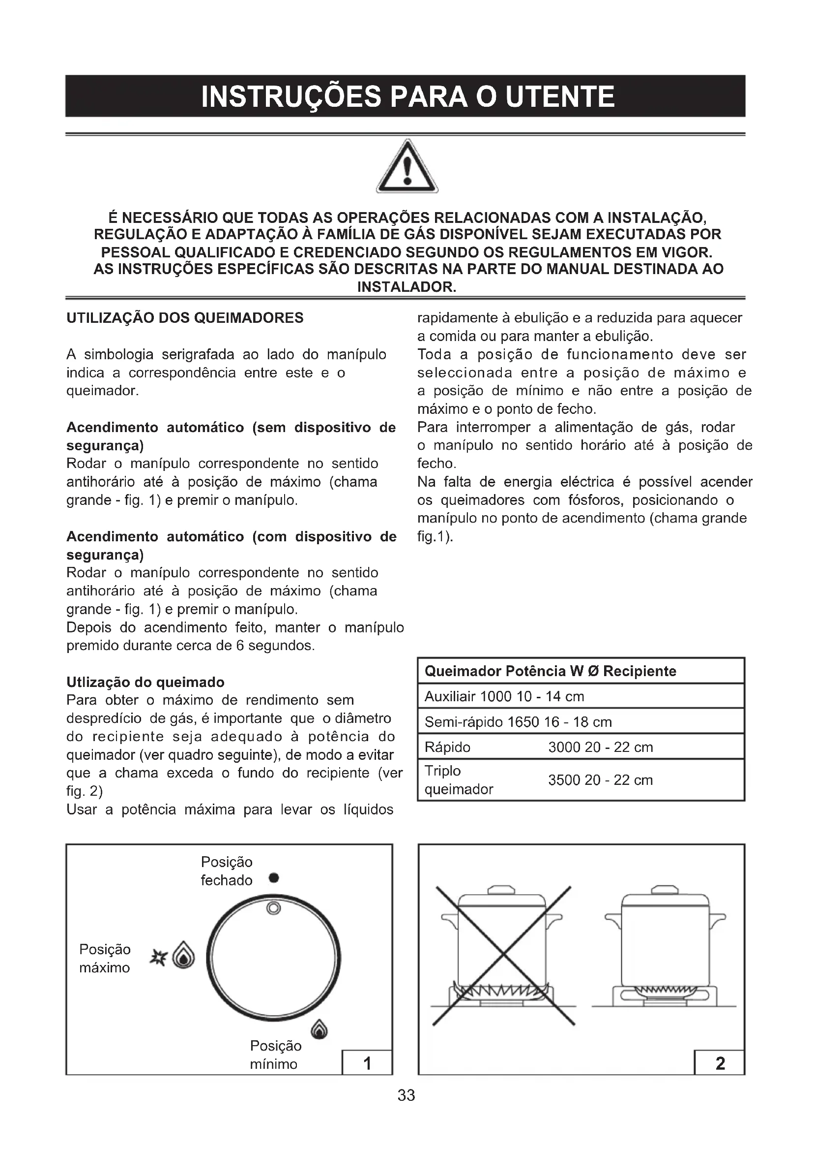 A simbologia serigrafada ao lado do manípulo indica a correspondência entre este e o queimador. Acendimento automático (sem dispositivo de segurança) Rodar o manípulo correspondente no sentido antihorário até à posição de máximo (chama grande - fig. 1) e premir o manípulo. Acendimento automático (com dispositivo de segurança) Rodar o manípulo correspondente no sentido antihorário até à posição de máximo (chama grande - fig. 1) e premir o manípulo. Depois do acendimento feito, manter o manípulo premido durante cerca de 6 segundos. Utlização do queimado Para obter o máximo de rendimento sem despredício de gás, é importante que o diâmetro do recipiente seja adequado à potência do queimador (ver quadro seguinte), de modo a evitar que a chama exceda o fundo do recipiente (ver fig. 2) Usar a potência máxima para levar os líquidos rapidamente à ebulição e a reduzida para aquecer a comida ou para manter a ebulição. Toda a posição de funcionamento deve ser seleccionada entre a posição de máximo e a posição de mínimo e não entre a posição de máximo e o ponto de fecho. Para interromper a alimentação de gás, rodar o manípulo no sentido horário até à posição de fecho. Na falta de energia eléctrica é possível acender os queimadores com fósforos, posicionando o manípulo no ponto de acendimento (chama grande fig.1). Queimador Potência W Ø Recipiente Auxiliair 1000 10 - 14 cm Semi-rápido 1650 16 - 18 cm Rápido 3000 20 - 22 cm Triplo queimador 3500 20 - 22 cm Posição fechado Posição máximo Posição mínimo34