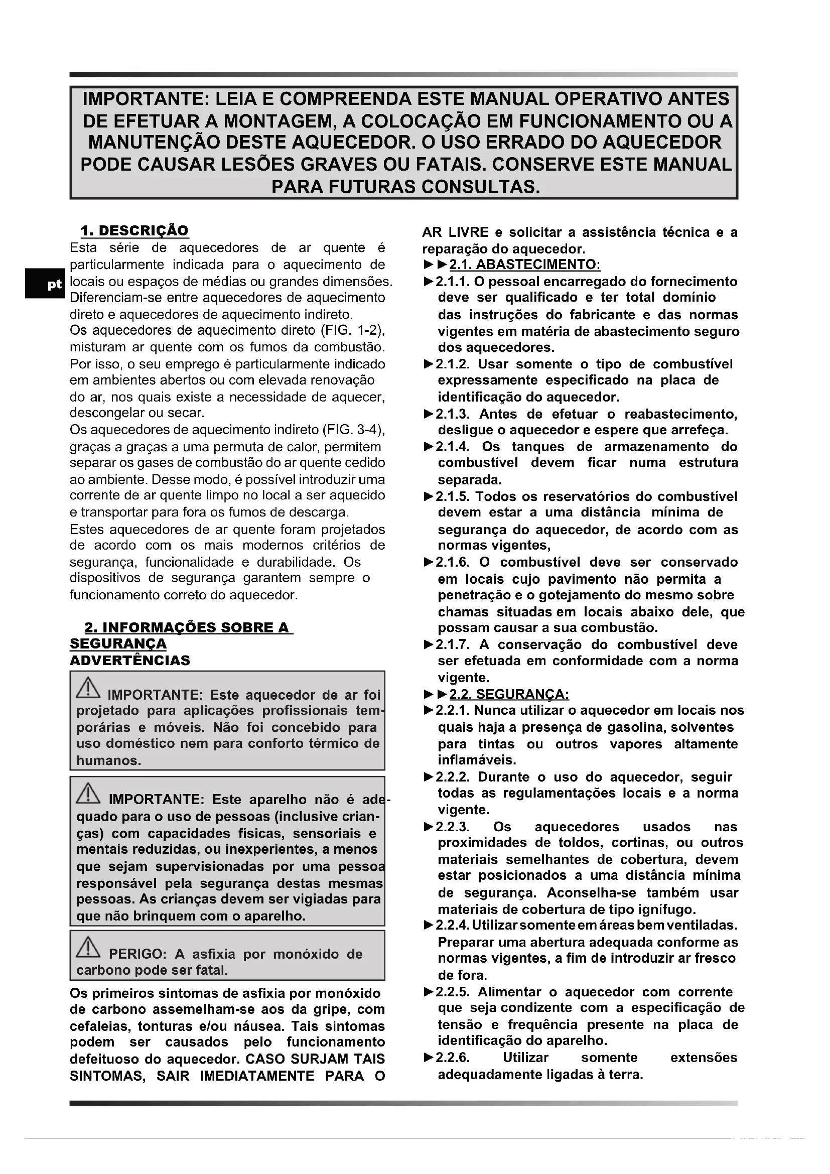 Esta série de aquecedores de ar quente é particularmente indicada para o aquecimento de locais ou espaços de médias ou grandes dimensões. Diferenciam-se entre aquecedores de aquecimento direto e aquecedores de aquecimento indireto. Os aquecedores de aquecimento direto (FIG. 1-2), misturam ar quente com os fumos da combustão. Por isso, o seu emprego é particularmente indicado em ambientes abertos ou com elevada renovação do ar, nos quais existe a necessidade de aquecer, descongelar ou secar. Os aquecedores de aquecimento indireto (FIG. 3-4), graças a graças a uma permuta de calor, permitem separar os gases de combustão do ar quente cedido ao ambiente. Desse modo, é possível introduzir uma corrente de ar quente limpo no local a ser aquecido e transportar para fora os fumos de descarga. Estes aquecedores de ar quente foram projetados de acordo com os mais modernos critérios de segurança, funcionalidade e durabilidade. Os dispositivos de segurança garantem sempre o funcionamento correto do aquecedor.