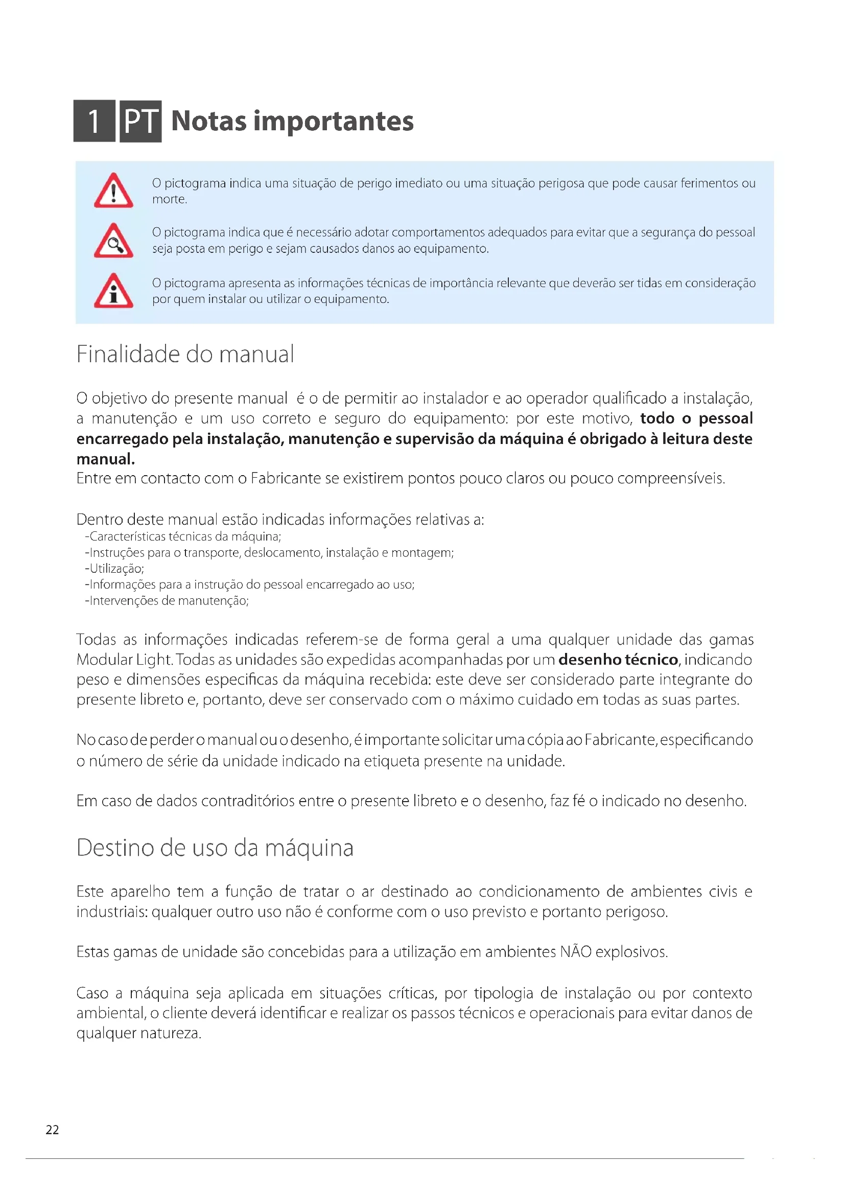Normas de segurança Competências requeridas para o uso e a manutenção da máquina Operador genérico: HABILITADO para a condução da máquina por meio dos comandos situados na botoeira do quadro elétrico de comando. Executa somente operações de comando da máquina, acendimento/desligamento Técnico de manutenção mecânico (qualificado): HABILITADO a efetuar intervenções de manutenção, regulação, reparação e substituição de órgãos mecânicos. Deve ser uma pessoa competente em sistemas mecânicos, portanto, capaz de efetuar a manutenção mecânica de forma satisfatória e segura, deve possuir preparação teórica e experiência manual. NÃO HABILITADO a intervenções em instalações elétricas. Técnico do fabricante (qualificado): HABILITADO a efetuar operações de natureza complexa em qualquer situação. Opera de acordo com o utilizador. Técnico de manutenção elétrico (qualificado): HABILITADO a efetuar intervenções de natureza elétrica, de regulação, de manutenção e de reparação elétrica. HABILITADO para operar em presença de tensão dentro dos armários e caixas de derivação. Deve ser uma pessoa competente em eletrónica e eletrotecnia, e portanto, capaz de intervir nos sistemas elétricos de forma satisfatória e segura, deve possuir preparação teórica e comprovada experiência. NÃO habilitado a intervenções de tipo mecânico. Competências requeridas para a instalação da máquina Os instaladores devem efetuar as operações com base na sua qualificação profissional: todas as atividades excluídas da sua competência (por ex. ligações elétricas), devem ser realizadas por operadores específicos e qualificados de forma a não colocar em perigo a sua segurança e a dos outros operadores que interagem com o equipamento. Operador de transporte e movimentação da máquina: pessoa autorizada, com reconhecida competência na utilização dos meios de transporte e levantamento. Instalador técnico: técnico especialista, enviado ou autorizado pelo fabricante ou seu mandatário com adequadas competências técnicas e formação para a instalação da máquina. Assistente: técnico sujeito a obrigações de diligência no exercício do levantamento e montagem equipamento. Este deve ser adequadamente formado e informado sobre as operações a desenrolar e sobre o planos de segurança do estaleiro/local de instalação. No presente manual, para cada operação, é especificado o técnico competente ao seu cumprimento. Os instaladores, utilizadores e técnicos de manutenção NÃO podem utilizar a máquina se: - não tem experiência e responsabilidade ou são menores de idade; - com deficiências físicas ou em más condições psicofísicas; - não dominam o ciclo de funcionamento da máquina; - não frequentaram um curso de formação de preparação teórico/prático, com o apoio de um operador ou condutor de máquina especializado, ou com o apoio de um técnico do fabricante. No presente manual, para cada operação, é especificado o técnico competente ao seu cumprimento.24 Antes da instalação, utilização e manutenção da máquina, ler atentamente o presente manual e guardá-lo com cuidado para cada nova consulta futura pelos vários operadores. Jamais retirar, rasgar ou reescrever qualquer uma das partes do manual. Todas as operações de instalação, montagem, ligações à rede elétrica e manutenção normal/ extraordinária devem ser realizadas apenas por técnicos que cumprem os requisitos legais, após ter desligado eletricamente a unidade e utilizando equipamento de proteção individual (por ex. luvas, óculos de proteção, etc.), segundo as normas em vigor no País de utilização e respeitando as normas relativas às instalações e à segurança no trabalho. Uma instalação, um uso ou manutenção diferentes das indicadas no manual podem provocar danos, lesões ou acidentes mortais, provocam a anulação da garantia e isentam o Fabricante de qualquer responsabilidade. Durante a movimentação ou a instalação do aparelho é obrigatória a utilização de vestuário de proteção e de meios adequados ao objetivo, a fim de prevenir acidentes e garantir a salvaguarda da sua segurança e aquela dos outros. Durante a montagem ou manutenção da máquina, NÃO é permitida a passagem, nem a permanência de pessoas não encarregadas da instalação perto da área de trabalho. Antes de efetuar qualquer intervenção de instalação ou manutenção desconectar o equipamento da alimentação elétrica. Antes de instalar o equipamento, verificar que as instalações estejam conformes às normas vigentes no País de utilização e ao que é indicado na placa do número de série. Será da responsabilidade do utilizador/instalador assegurar-se da estabilidade estática e dinâmica relativa à instalação e a preparar os ambientes de forma que as pessoas não competentes e autorizadas NÃO tenham acesso à máquina ou aos comandos da mesma. Será da responsabilidade do utilizador/instalador assegurar-se que as condições atmosféricas não prejudiquem a segurança das pessoas e das coisas durante as fases de instalação, utilização e manutenção. Certificar-se que a aspiração do ar não aconteça em proximidade de descargas, fumos de combustão ou outro elementos contaminantes. NÃO instalar o equipamento em locais expostos a fortes ventos, salinização, chamas livres ou temperaturas superiores a 40°C (104°F). No final da instalação, instruir o utilizador na correta utilização da máquina. Se o equipamento não funcionar ou se existirem alterações funcionais ou estruturais, desligá- lo da alimentação elétrica e contactar um centro de assistência autorizado pelo Fabricante ou pelo Revendedor sem tentar proceder à sua reparação. Para eventuais substituições, solicitar exclusivamente a utilização de peças sobressalentes originais. Intervenções, adulterações ou alterações não expressamente aut