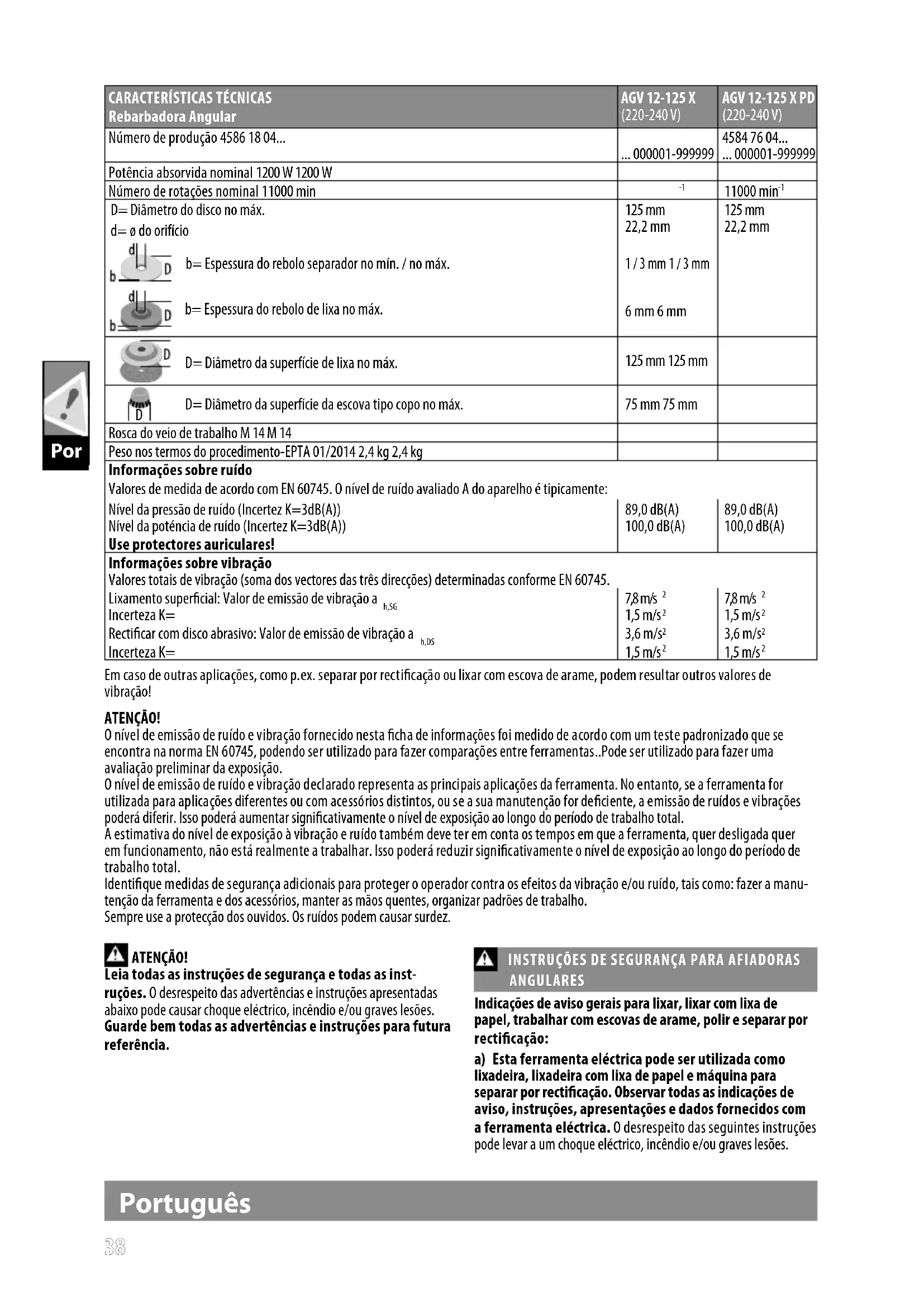 Em caso de outras aplicações, como p.ex. separar por recticação ou lixar com escova de arame, podem resultar outros valores de vibração! ATENÇÃO! O nível de emissão de ruído e vibração fornecido nesta cha de informações foi medido de acordo com um teste padronizado que se encontra na norma EN 60745, podendo ser utilizado para fazer comparações entre ferramentas..Pode ser utilizado para fazer uma avaliação preliminar da exposição. O nível de emissão de ruído e vibração declarado representa as principais aplicações da ferramenta. No entanto, se a ferramenta for utilizada para aplicações diferentes ou com acessórios distintos, ou se a sua manutenção for deciente, a emissão de ruídos e vibrações poderá diferir. Isso poderá aumentar signicativamente o nível de exposição ao longo do período de trabalho total. A estimativa do nível de exposição à vibração e ruído também deve ter em conta os tempos em que a ferramenta, quer desligada quer em funcionamento, não está realmente a trabalhar. Isso poderá reduzir signicativamente o nível de exposição ao longo do período de trabalho total. Identique medidas de segurança adicionais para proteger o operador contra os efeitos da vibração e/ou ruído, tais como: fazer a manu- tenção da ferramenta e dos acessórios, manter as mãos quentes, organizar padrões de trabalho. Sempre use a protecção dos ouvidos. Os ruídos podem causar surdez. ATENÇÃO! Leia todas as instruções de segurança e todas as inst- ruções. O desrespeito das advertências e instruções apresentadas abaixo pode causar choque eléctrico, incêndio e/ou graves lesões. Guarde bem todas as advertências e instruções para futura referência. INSTRUÇÕES DE SEGURANÇA PARA AFIADORAS ANGULARES Indicações de aviso gerais para lixar, lixar com lixa de papel, trabalhar com escovas de arame, polir e separar por recticação: a) Esta ferramenta eléctrica pode ser utilizada como lixadeira, lixadeira com lixa de papel e máquina para separar por recticação. Observar todas as indicações de aviso, instruções, apresentações e dados fornecidos com a ferramenta eléctrica. O desrespeito das seguintes instruções pode levar a um choque eléctrico, incêndio e/ou graves lesões.3939 Por Português b) Esta ferramenta eléctrica não é adequada para para polir.Utilizações, para as quais a máquina não tenha sido prevista, podem causar perigos e ferimentos. c) Não utilizar acessórios, que não foram especialmente previstos e recomendados pelo fabricante para serem utilizados com esta ferramenta eléctrica. O facto de poder xar o acessório a esta ferramenta eléctrica, não garante uma aplicação segura. d) As rotações admissíveis da ferramenta de trabalho devem ser pelo menos tão elevadas como as rotações máximas indicadas na ferramenta eléctrica. Os acessórios que rodam mais rapidamente do que o permitido podem partir-se e ser projectados. e) O diâmetro exterior e a espessura da ferramenta de trabalho devem corresponder às indicações de medida da sua ferramenta eléctrica. Ferramentas de trabalho incorrec- tamente medidas podem não ser sucientemente blindadas nem controladas. f) As roscas das peças de acessório devem corresponder com a rosca do fuso de esmerilhamento. Nas peças de acessório xadas mediante ange, o furo para o mandrel na peça de acessório deve corresponder com o diâmetro do ange de localização. Peças de acessório que não caibam no mandril de montagem do aparelho, operam de forma desequilib- rada, vibram excessivamente e podem levar à perda do controlo sobre a ferramenta. g) Não utilizar ferramentas de trabalho danicadas. Antes de cada utilização deverá controlar as ferramentas de trabalho, e vericar se por exemplo os discos abrasivos apre- sentam ssuras e estilhaços, se pratos abrasivos apresentam ssuras, se há desgaste ou forte atrição, se as escovas de arame apresentam arames soltos ou quebrados. Se a ferra- menta eléctrica ou a ferramenta de trabalho caírem, deverá vericar se sofreram danos, ou trocar por uma ferramenta de trabalho intacta. Após ter controlado e introduzido a ferramenta de trabalho, deverá manter-se, e as pessoas que se encontrem nas proximidades, fora do nível de rotação da ferramenta de trabalho e permitir que a ferramenta eléc- trica funcione durante um minuto com o máximo número de rotação. A maioria das ferramentas de trabalho danicadas quebram durante este período de teste. h) Utilizar um equipamento de protecção pessoal. De acordo com a aplicação, deverá utilizar uma protecção para todo o rosto, protecção para os olhos ou um óculos protector. Se for necessário, deverá utilizar uma máscara contra pó, protecção auricular, luvas de protecção ou um avental especial, para proteger-se de pequenas partículas de amoladura e de material. Os olhos devem ser protegidos contra partículas a voar, produzidas durante as diversas aplicações. A máscara contra pó ou a máscara de respiração deve ser capaz de ltrar o pó produzido durante a respectiva aplicação. Se for sujeito durante longo tempo a fortes ruídos, poderá sofrer a perda da capacidade auditiva.