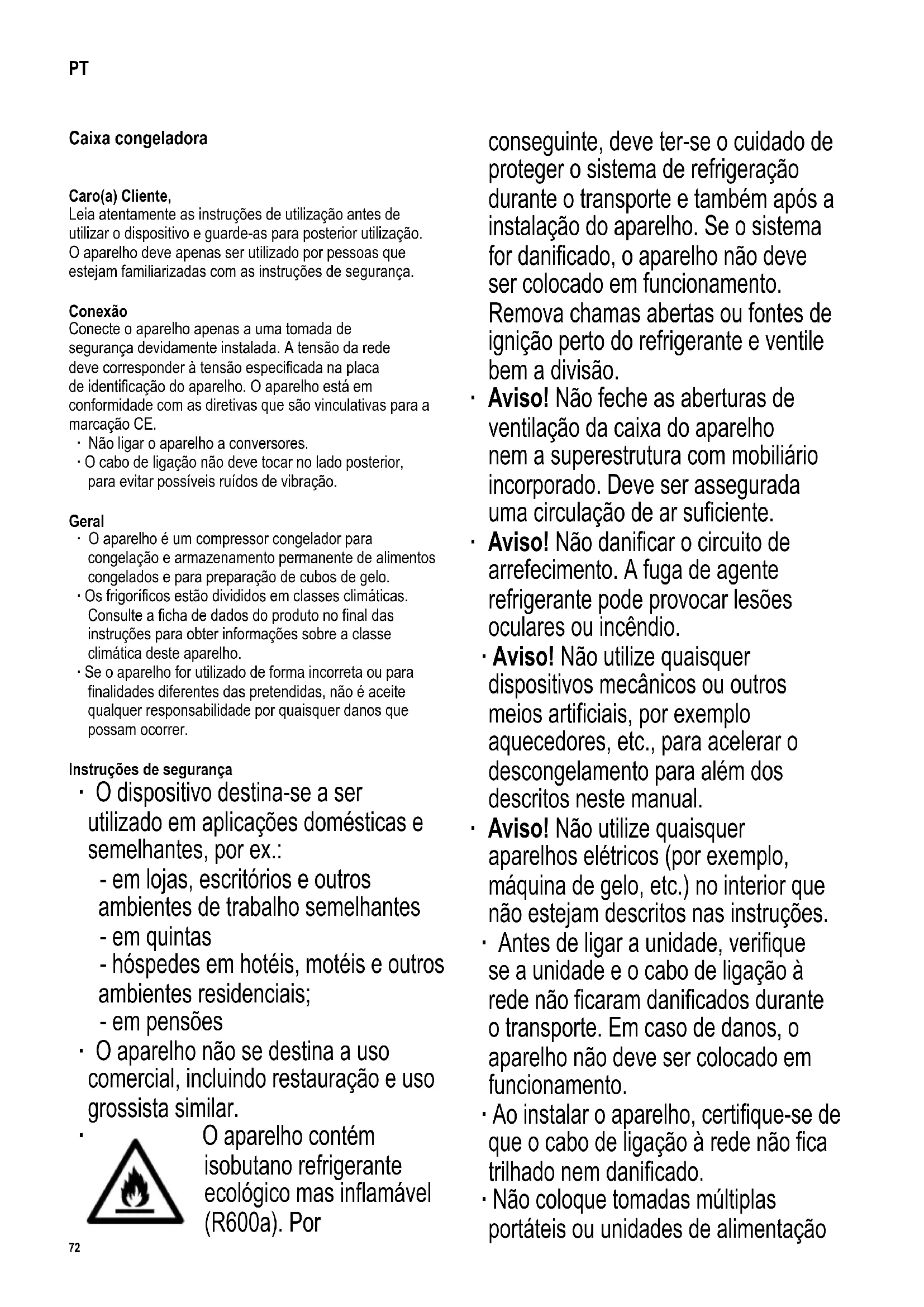 Caixa congeladora Caro(a) Cliente, Leia atentamente as instruções de utilização antes de utilizar o dispositivo e guarde-as para posterior utilização. O aparelho deve apenas ser utilizado por pessoas que estejam familiarizadas com as instruções de segurança. Conexão Conecte o aparelho apenas a uma tomada de segurança devidamente instalada. A tensão da rede deve corresponder à tensão especicada na placa de identicação do aparelho. O aparelho está em conformidade com as diretivas que são vinculativas para a marcação CE. ∙ Não ligar o aparelho a conversores. ∙ O cabo de ligação não deve tocar no lado posterior, para evitar possíveis ruídos de vibração. Geral ∙ O aparelho é um compressor congelador para congelação e armazenamento permanente de alimentos congelados e para preparação de cubos de gelo. ∙ Os frigorícos estão divididos em classes climáticas. Consulte a cha de dados do produto no nal das instruções para obter informações sobre a classe climática deste aparelho. ∙ Se o aparelho for utilizado de forma incorreta ou para nalidades diferentes das pretendidas, não é aceite qualquer responsabilidade por quaisquer danos que possam ocorrer. Instruções de segurança ∙ O dispositivo destina-se a ser utilizado em aplicações domésticas e semelhantes, por ex.: - em lojas, escritórios e outros ambientes de trabalho semelhantes - em quintas - hóspedes em hotéis, motéis e outros ambientes residenciais; - em pensões ∙ O aparelho não se destina a uso comercial, incluindo restauração e uso grossista similar.