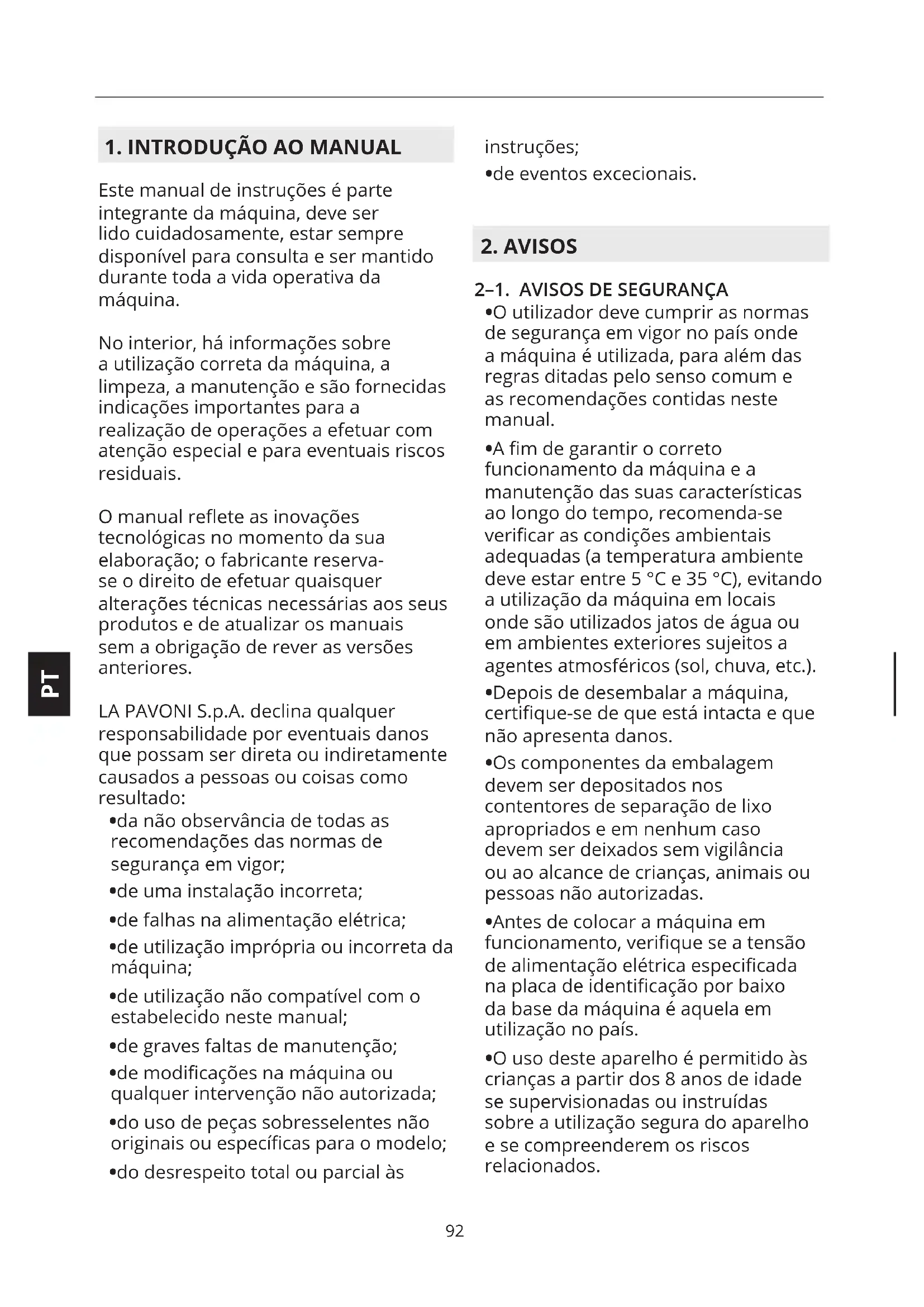Este manual de instruções é parte integrante da máquina, deve ser lido cuidadosamente, estar sempre disponível para consulta e ser mantido durante toda a vida operativa da máquina. No interior, há informações sobre a utilização correta da máquina, a limpeza, a manutenção e são fornecidas indicações importantes para a realização de operações a efetuar com atenção especial e para eventuais riscos residuais. O manual reete as inovações tecnológicas no momento da sua elaboração; o fabricante reserva- se o direito de efetuar quaisquer alterações técnicas necessárias aos seus produtos e de atualizar os manuais sem a obrigação de rever as versões anteriores. LA PAVONI S.p.A. declina qualquer responsabilidade por eventuais danos que possam ser direta ou indiretamente causados a pessoas ou coisas como resultado: