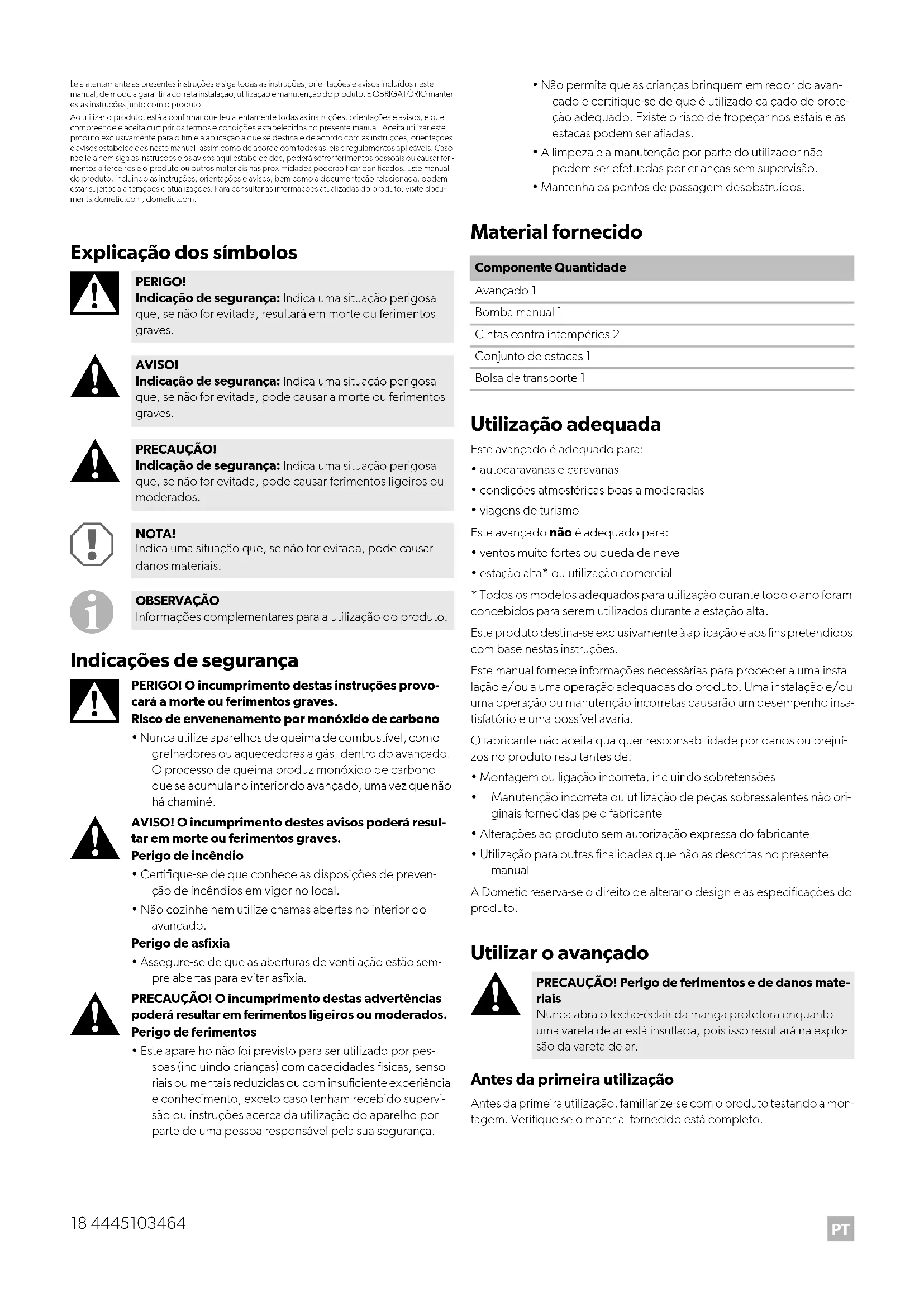 Leia atentamente as presentes instruções e siga todas as instruções, orientações e avisos incluídos neste manual, de modo a garantir a correta instalação, utilização e manutenção do produto. É OBRIGATÓRIO manter estas instruções junto com o produto. Ao utilizar o produto, está a confirmar que leu atentamente todas as instruções, orientações e avisos, e que compreende e aceita cumprir os termos e condições estabelecidos no presente manual. Aceita utilizar este produto exclusivamente para o fim e a aplicação a que se destina e de acordo com as instruções, orientações e avisos estabelecidos neste manual, assim como de acordo com todas as leis e regulamentos aplicáveis. Caso não leia nem siga as instruções e os avisos aqui estabelecidos, poderá sofrer ferimentos pessoais ou causar feri- mentos a terceiros e o produto ou outros materiais nas proximidades poderão ficar danificados. Este manual do produto, incluindo as instruções, orientações e avisos, bem como a documentação relacionada, podem estar sujeitos a alterações e atualizações. Para consultar as informações atualizadas do produto, visite docu- ments.dometic.com, dometic.com. Explicação dos símbolos