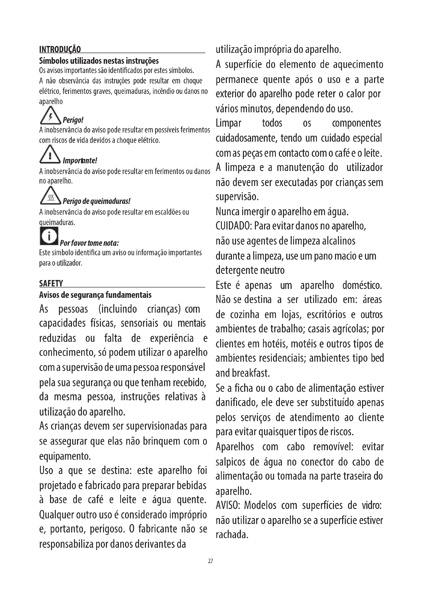 - El material del panel debe ser adecuado para el peso de la máquina de aproximadamente 25 kg. ES27 INTRODUÇÃO Símbolos utilizados nestas instruções Os avisos importantes são identificados por estes símbolos. A não observância das instruções pode resultar em choque elétrico, ferimentos graves, queimaduras, incêndio ou danos no aparelho Perigo! A inobservância do aviso pode resultar em possíveis ferimentos com riscos de vida devidos a choque elétrico. Import ante! A inobservância do aviso pode resultar em ferimentos ou danos no aparelho. Perigo de queimaduras! A inobservância do aviso pode resultar em escaldões ou queimaduras. Por favor tome nota: Este símbolo identifica um aviso ou informação importantes para o utilizador. SAFETY Avisos de segurança fundamentais As pessoas (incluindo crianças) com capacidades físicas, sensoriais ou mentais reduzidas ou falta de experiência e conhecimento, só podem utilizar o aparelho com a supervisão de uma pessoa responsável pela sua segurança ou que tenham recebido, da mesma pessoa, instruções relativas à utilização do aparelho. As crianças devem ser supervisionadas para se assegurar que elas não brinquem com o equipamento. Uso a que se destina: este aparelho foi projetado e fabricado para preparar bebidas à base de café e leite e água quente. Qualquer outro uso é considerado impróprio e, portanto, perigoso. O fabricante não se responsabiliza por danos derivantes da utilização imprópria do aparelho. A superfície do elemento de aquecimento permanece quente após o uso e a parte exterior do aparelho pode reter o calor por vários minutos, dependendo do uso. Limpar todos os componentes cuidadosamente, tendo um cuidado especial com as peças em contacto com o café e o leite. A limpeza e a manutenção do utilizador não devem ser executadas por crianças sem supervisão. Nunca imergir o aparelho em água. CUIDADO: Para evitar danos no aparelho, não use agentes de limpeza alcalinos durante a limpeza, use um pano macio e um detergente neutro Este é apenas um aparelho doméstico. Não se destina a ser utilizado em: áreas de cozinha em lojas, escritórios e outros ambientes de trabalho; casais agrícolas; por clientes em hotéis, motéis e outros tipos de ambientes residenciais; ambientes tipo bed and breakfast. Se a ficha ou o cabo de alimentação estiver danificado, ele deve ser substituído apenas pelos serviços de atendimento ao cliente para evitar quaisquer tipos de riscos. Aparelhos com cabo removível: evitar salpicos de água no conector do cabo de alimentação ou tomada na parte traseira do aparelho. AVISO: Modelos com superfícies de vidro: não utilizar o aparelho se a superfície estiver rachada.28 APENAS PARA MERCADOS EUROPEUS: Este aparelho pode ser utilizado por crianças com idade igual ou superior a 8 anos, só com a supervisão de um adulto ou se tiverem recebido instruções relativas ao uso do aparelho de forma segura e compreendam o risco envolvido. A limpeza e a manutenção pelo utilizador não devem ser efetuadas por crianças, a não ser que tenham mais de 8 anos e sejam supervisionadas. Manter o aparelho e o seu Cabo fora do alcance de crianças com idade inferior aos 8 anos. O aparelho pode ser utilizado por pessoas com capacidades físicas, sensoriais ou mentais reduzidas ou com falta de experiência e conhecimento, só com a supervisão de uma pessoa responsável pela sua segurança ou que tenham recebido, da mesma pessoa, instruções relativas à utilização do aparelho de forma segura e compreendam o risco envolvido. As crianças nunca devem brincar com o equipamento. Quando não estiver em uso e antes de o limpar, desligar sempre o aparelho. Superfícies marcadas com este símbolo ficam quentes durante o uso (o símbolo está presente apenas em alguns modelos). Perigo! Este é um aparelho elétrico, por isso é importante respeitar os seguintes avisos de segurança: