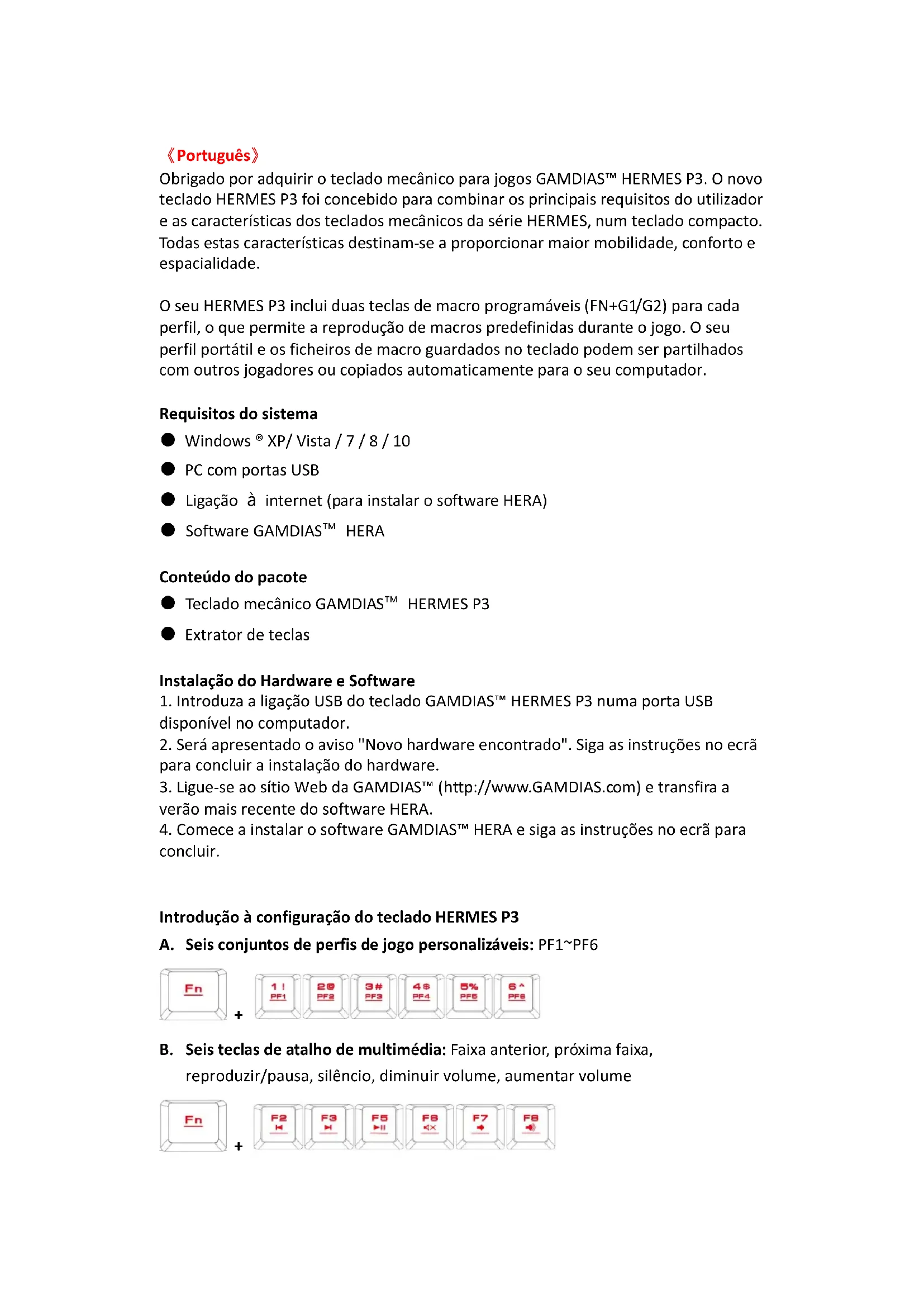 Obrigado por adquirir o teclado mecânico para jogos GAMDIAS™ HERMES P3. O novo teclado HERMES P3 foi concebido para combinar os principais requisitos do utilizador e as características dos teclados mecânicos da série HERMES, num teclado compacto. Todas estas características destinam-se a proporcionar maior mobilidade, conforto e espacialidade. O seu HERMES P3 inclui duas teclas de macro programáveis (FN+G1/G2) para cada perfil, o que permite a reprodução de macros predefinidas durante o jogo. O seu perfil portátil e os ficheiros de macro guardados no teclado podem ser partilhados com outros jogadores ou copiados automaticamente para o seu computador. Requisitos do sistema ● Windows ® XP/ Vista / 7 / 8 / 10 ● PC com portas USB ● Ligação à internet (para instalar o software HERA) ● Software GAMDIAS™ HERA Conteúdo do pacote ● Teclado mecânico GAMDIAS™ HERMES P3 ● Extrator de teclas Instalação do Hardware e Software