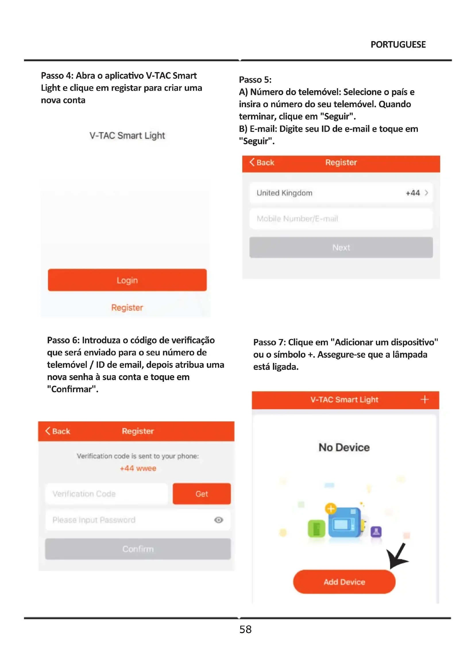 Passo 5: A) Número do telemóvel: Selecione o país e insira o número do seu telemóvel. Quando terminar, clique em "Seguir". B) E-mail: Digite seu ID de e-mail e toque em "Seguir". Passo 7: Clique em "Adicionar um disposivo" ou o símbolo +. Assegure-se que a lâmpada está ligada.PORTUGUESE