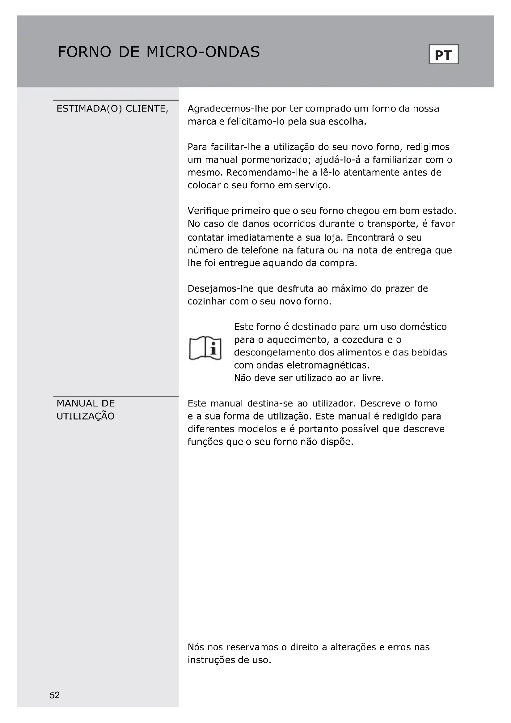 ESTIMADA(O) CLIENTE, Agradecemos-lhe por ter comprado um forno da nossa marca e felicitamo-lo pela sua escolha. Para facilitar-lhe a utilização do seu novo forno, redigimos um manual pormenorizado; ajudá-lo-á a familiarizar com o mesmo. Recomendamo-lhe a lê-lo atentamente antes de colocar o seu forno em serviço. Verifique primeiro que o seu forno chegou em bom estado. No caso de danos ocorridos durante o transporte, é favor contatar imediatamente a sua loja. Encontrará o seu número de telefone na fatura ou na nota de entrega que lhe foi entregue aquando da compra. Desejamos-lhe que desfruta ao máximo do prazer de cozinhar com o seu novo forno. Este forno é destinado para um uso doméstico para o aquecimento, a cozedura e o descongelamento dos alimentos e das bebidas com ondas eletromagnéticas. Não deve ser utilizado ao ar livre. MANUAL DE UTILIZAÇÃO Este manual destina-se ao utilizador. Descreve o forno e a sua forma de utilização. Este manual é redigido para diferentes modelos e é portanto possível que descreve funções que o seu forno não dispõe. Nós nos reservamos o direito a alterações e erros nas instruções de uso.