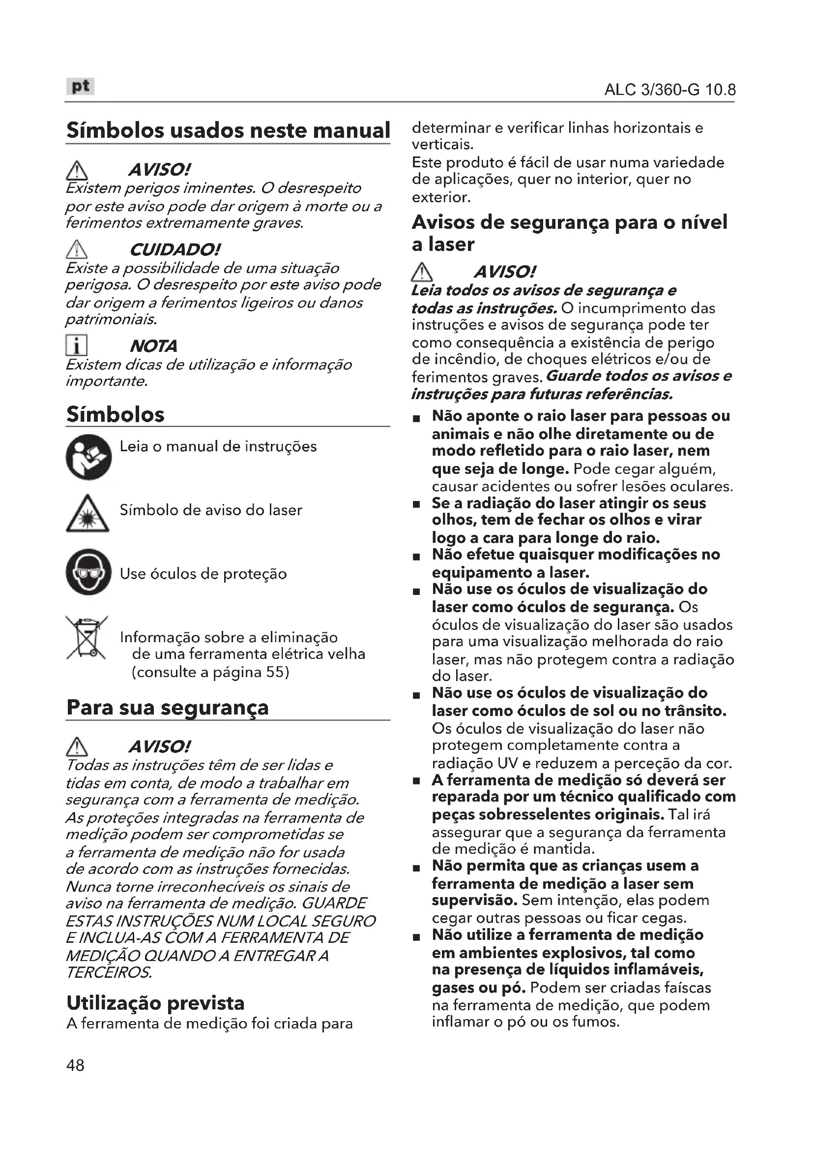 Não utilize a ferramenta de medição em ambientes explosivos, tal como na presença de líquidos inflamáveis, gases ou pó. Podem ser criadas faíscas na ferramenta de medição, que podem inflamar o pó ou os fumos.49 ALC 3/360-G 10.8