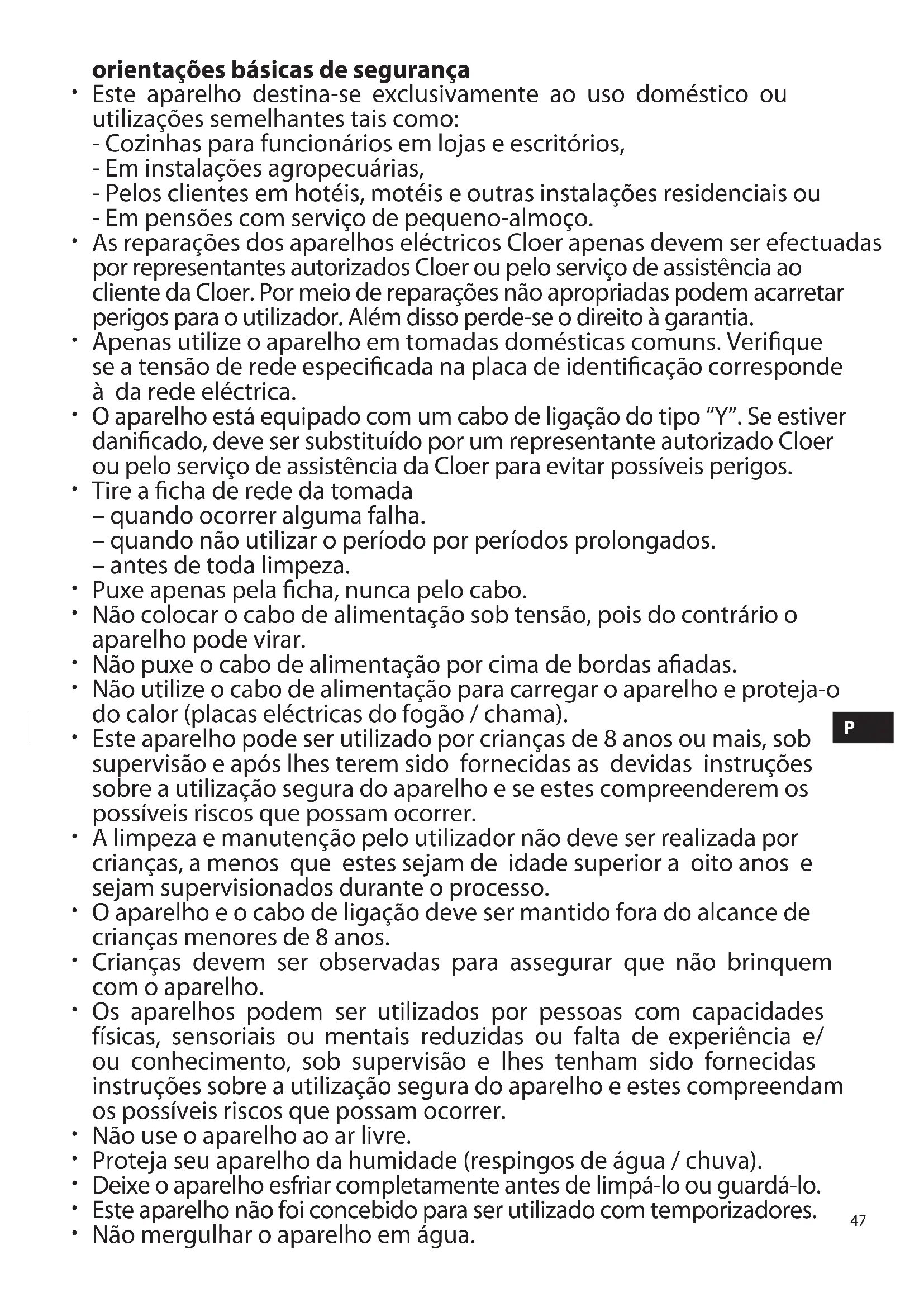 orientações básicas de segurança Este aparelho destina-se exclusivamente ao uso doméstico ou utilizações semelhantes tais como: - Cozinhas para funcionários em lojas e escritórios, - Em instalações agropecuárias, - Pelos clientes em hotéis, motéis e outras instalações residenciais ou - Em pensões com serviço de pequeno-almoço. As reparações dos aparelhos eléctricos Cloer apenas devem ser efectuadas por representantes autorizados Cloer ou pelo serviço de assistência ao cliente da Cloer. Por meio de reparações não apropriadas podem acarretar perigos para o utilizador. Além disso perde-se o direito à garantia. Apenas utilize o aparelho em tomadas domésticas comuns. Verique se a tensão de rede especicada na placa de identicação corresponde à da rede eléctrica. O aparelho está equipado com um cabo de ligação do tipo “Y”. Se estiver danicado, deve ser substituído por um representante autorizado Cloer ou pelo serviço de assistência da Cloer para evitar possíveis perigos. Tire a cha de rede da tomada – quando ocorrer alguma falha. – quando não utilizar o período por períodos prolongados. – antes de toda limpeza. Puxe apenas pela cha, nunca pelo cabo. Não colocar o cabo de alimentação sob tensão, pois do contrário o aparelho pode virar. Não puxe o cabo de alimentação por cima de bordas aadas. Não utilize o cabo de alimentação para carregar o aparelho e proteja-o do calor (placas eléctricas do fogão / chama). Este aparelho pode ser utilizado por crianças de 8 anos ou mais, sob supervisão e após lhes terem sido fornecidas as devidas instruções sobre a utilização segura do aparelho e se estes compreenderem os possíveis riscos que possam ocorrer. A limpeza e manutenção pelo utilizador não deve ser realizada por crianças, a menos que estes sejam de idade superior a oito anos e sejam supervisionados durante o processo. O aparelho e o cabo de ligação deve ser mantido fora do alcance de crianças menores de 8 anos. Crianças devem ser observadas para assegurar que não brinquem com o aparelho. Os aparelhos podem ser utilizados por pessoas com capacidades físicas, sensoriais ou mentais reduzidas ou falta de experiência e/ ou conhecimento, sob supervisão e lhes tenham sido fornecidas instruções sobre a utilização segura do aparelho e estes compreendam os possíveis riscos que possam ocorrer. Não use o aparelho ao ar livre. Proteja seu aparelho da humidade (respingos de água / chuva). Deixe o aparelho esfriar completamente antes de limpá-lo ou guardá-lo. Este aparelho não foi concebido para ser utilizado com temporizadores. Não mergulhar o aparelho em água.