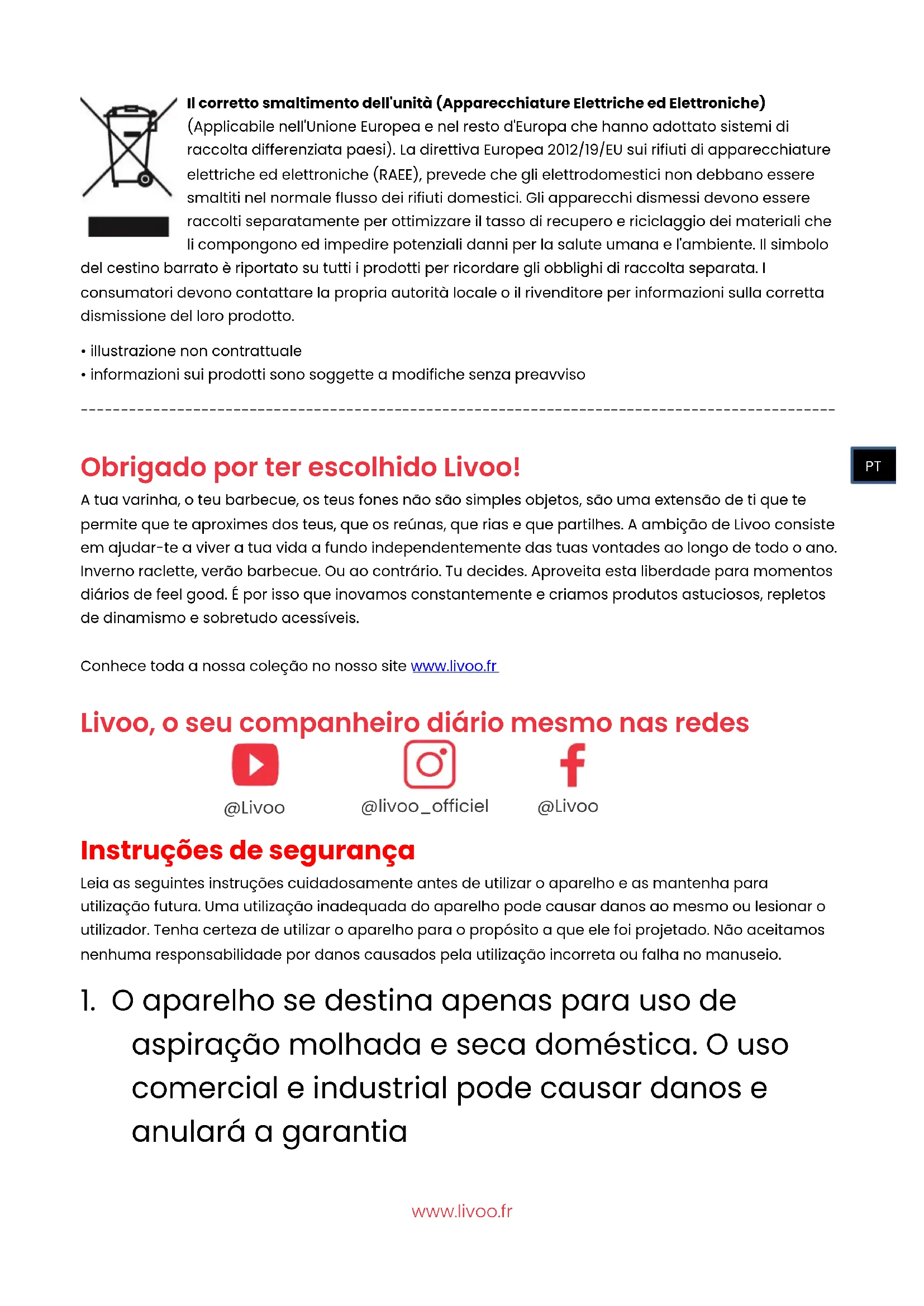 Obrigado por ter escolhido Livoo! A tua varinha, o teu barbecue, os teus fones não são simples objetos, são uma extensão de ti que te permite que te aproximes dos teus, que os reúnas, que rias e que partilhes. A ambição de Livoo consiste em ajudar-te a viver a tua vida a fundo independentemente das tuas vontades ao longo de todo o ano. Inverno raclette, verão barbecue. Ou ao contrário. Tu decides. Aproveita esta liberdade para momentos diários de feel good. É por isso que inovamos constantemente e criamos produtos astuciosos, repletos de dinamismo e sobretudo acessíveis. Conhece toda a nossa coleção no nosso site www.livoo.fr Livoo, o seu companheiro diário mesmo nas redes