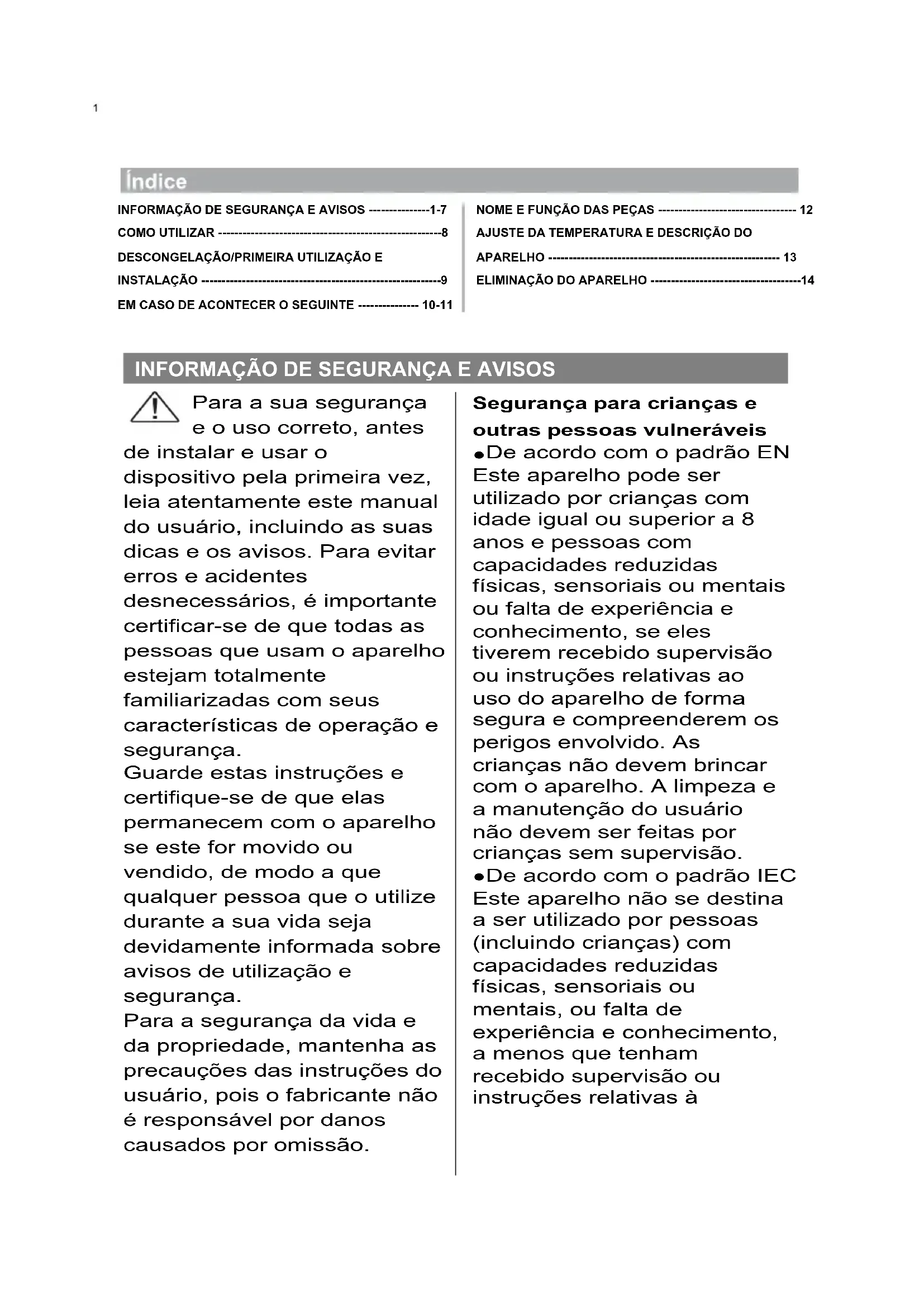De acordo com o padrão EN Este aparecido pode ser realizado por crianças com idade igual ou superior a 8 anos e pessoas com capacidades reduzidas físicas, sensoriais ou mentalais ou falta de experiencia e conheçimento, se eles tiverem recebido supervisão ou instruções relatives ao uso do aparecido de forma segura e comprehenderem os perigos envolvido. As crianças não devem brincar com o aparecido. A limpeza e a manutenção do usuario não devem ser feitas por crianças sem supervisão.