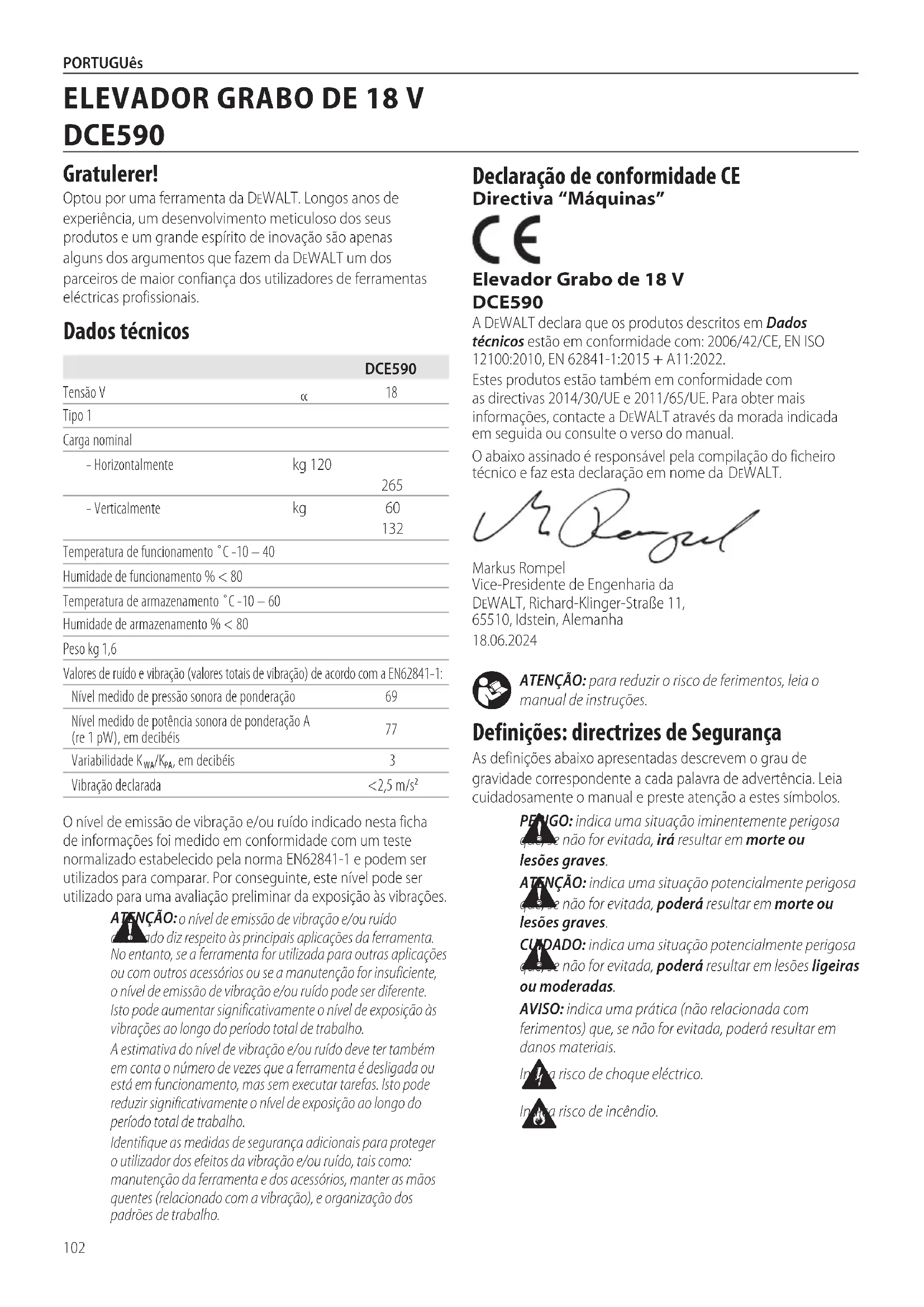 dem når du løfter.102 PORTUGUês ATENÇÃO: para reduzir o risco de ferimentos, leia o manual deinstruções. Definições: directrizes de Segurança As definições abaixo apresentadas descrevem o grau de gravidade correspondente a cada palavra de advertência. Leia cuidadosamente o manual e preste atenção a estessímbolos. PERIGO: indica uma situação iminentemente perigosa que, se não for evitada, irá resultar em morte ou lesõesgraves. ATENÇÃO: indica uma situação potencialmente perigosa que, se não for evitada, poderá resultar em morte ou lesõesgraves. CUIDADO: indica uma situação potencialmente perigosa que, se não for evitada, poderá resultar em lesões ligeiras oumoderadas.AVISO: indica uma prática (não relacionada com ferimentos) que, se não for evitada, poderá resultar em danosmateriais. Indica risco de choqueeléctrico. Indica risco deincêndio. Declaração de conformidade CE Directiva “Máquinas” Elevador Grabo de 18 V DCE590 A DeWALT declara que os produtos descritos em Dados técnicos estão em conformidade com: 2006/42/CE, EN ISO 12100:2010, EN 62841-1:2015 + A11:2022.Estes produtos estão também em conformidade com as directivas 2014/30/UE e 2011/65/UE. Para obter mais informações, contacte a DeWALT através da morada indicada em seguida ou consulte o verso do manual.O abaixo assinado é responsável pela compilação do ficheiro técnico e faz esta declaração em nome da DeWALT.Markus Rompel Vice-Presidente de Engenharia da DeWALT, Richard-Klinger-Straße 11, 65510, Idstein, Alemanha 18.06.2024DCE590Tensão V