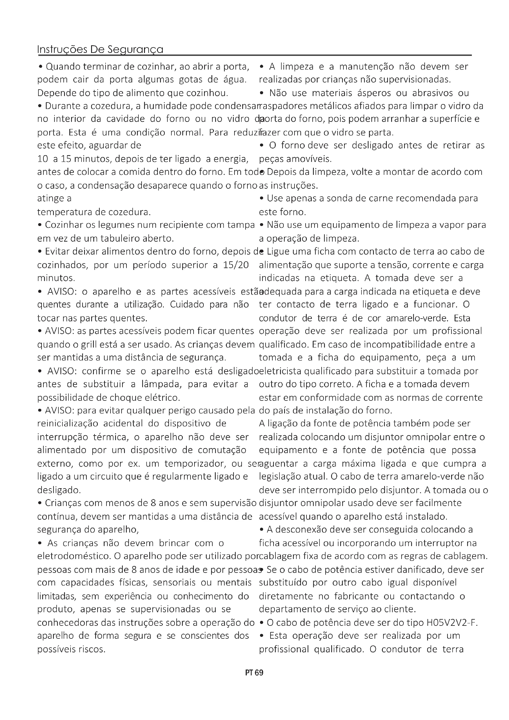 - Esta operação deve ser realizada por um profissional qualificado. O condutor de terra PT 69(amarelo- verde) deve ser aproximadamente 10 mm mais comprido do que os restantes condutores. Para qualquer reparação, consulte apenas o Departamento de Serviço ao Cliente e solicite o uso de peças originais.