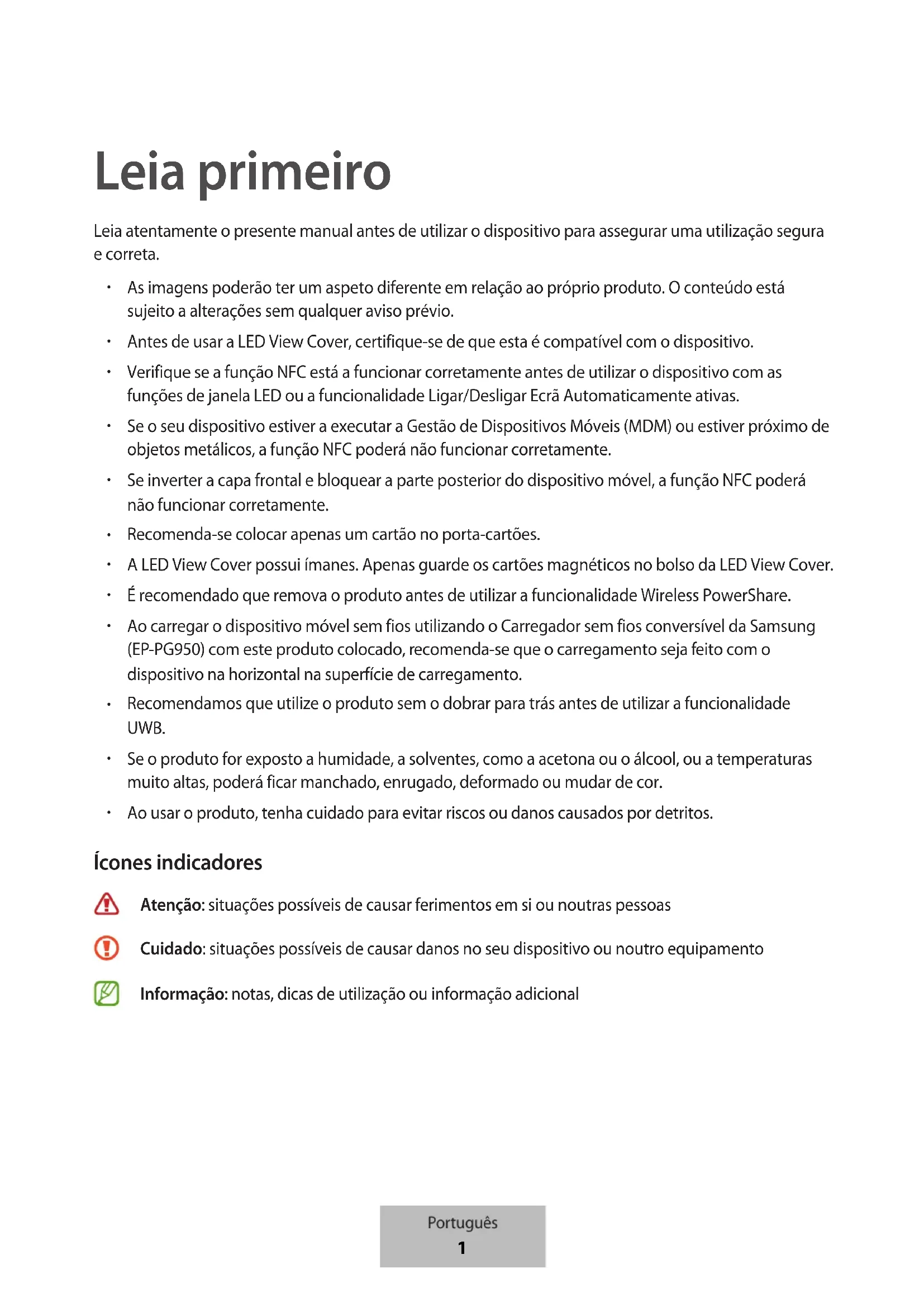 Ao usar o produto, tenha cuidado para evitar riscos ou danos causados por detritos. Ícones indicadores Atenção: situações possíveis de causar ferimentos em si ou noutras pessoas Cuidado: situações possíveis de causar danos no seu dispositivo ou noutro equipamento Informação: notas, dicas de utilização ou informação adicional Português