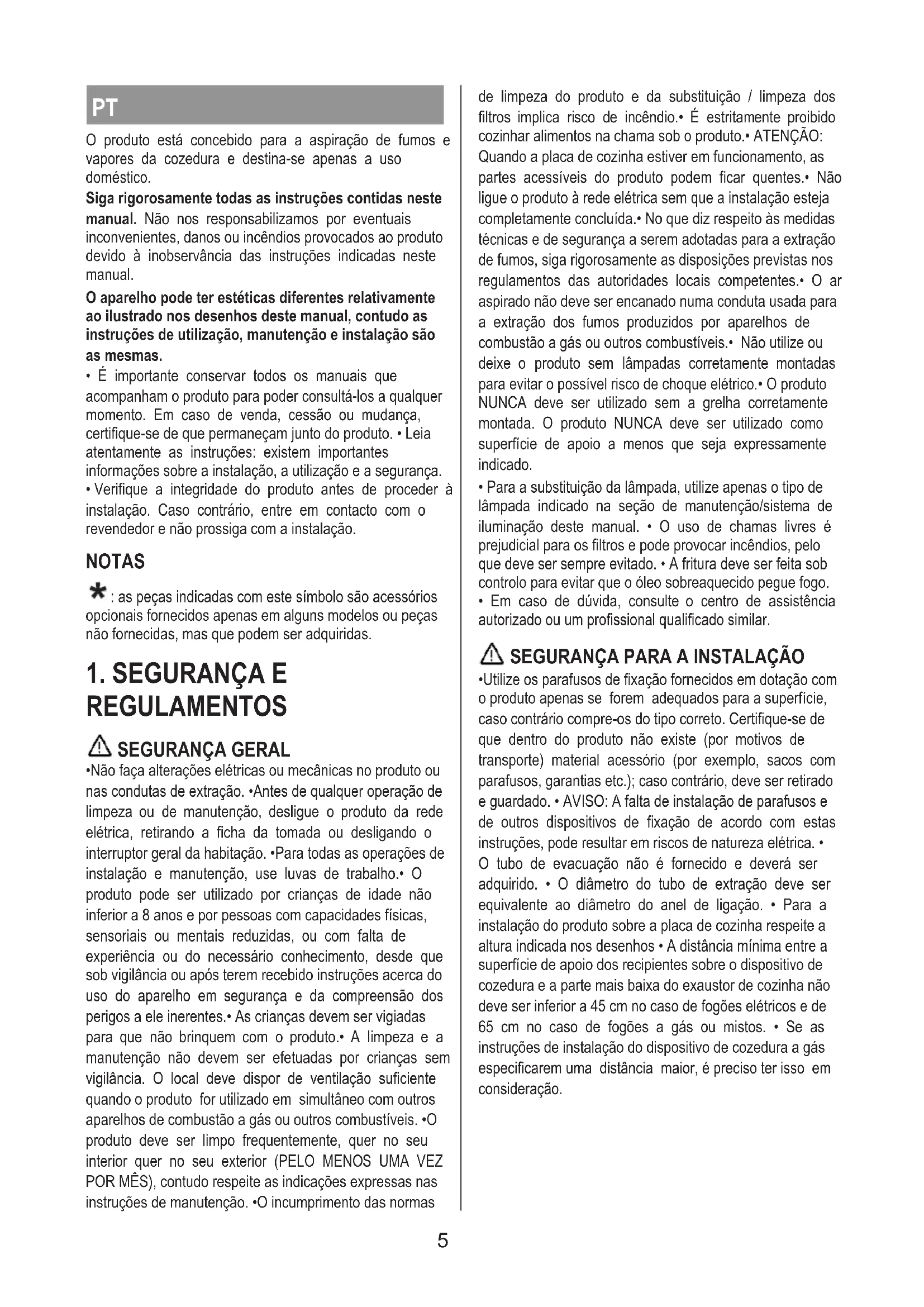 - Não faça alterações elétricas ou mecânicas no produto ou nas condutas de extração. •Antes de qualquer operação de limpeza ou de manutenção, desligue o produto da rede elétrica, retirando a ficha da tomada ou desligando o interruptor geral da habitação. •Para todas as operações de instalação e manutenção, use luvas de trabalho.• O produto pode ser utilizado por crianças de idade não inferior a 8 anos e por pessoas com capacidades físicas, sensoriais ou mentais reduzidas, ou com falta de experiência ou do necessário conhecimento, desde que sob vigilância ou após terem recebido instruções acerca do uso do aparelho em segurança e da compreensão dos perigos a ele inerentes.• As crianças devem ser vigiadas para que não brinquem com o produto.• A limpeza e a manutenção não devem ser efetuadas por crianças sem vigilância. O local deve dispor de ventilação suficiente quando o produto for utilizado em simultâneo com outros aparelhos de combustão a gás ou outros combustíveis. •O produto deve ser limpo frequentemente, quer no seu interior quer no seu exterior (PELO MENOS UMA VEZ POR MÊS), contudo respeite as indicações expressas nas instruções de manutenção. •O incumprimento das normas de limpeza do produto e da substituição / limpeza dos filtros implica risco de incêndio.• É estritamente proibido cozinhar alimentos na chama sob o produto.• ATENÇÃO: Quando a placa de cozinha estiver em funcionamento, as partes acessíveis do produto podem ficar quentes.• Não ligue o produto à rede elétrica sem que a instalação esteja completamente concluída.• No que diz respeito às medidas técnicas e de segurança a serem adotadas para a extração de fumos, siga rigorosamente as disposições previstas nos regulamentos das autoridades locais competentes.• O ar aspirado não deve ser encanado numa conduta usada para a extração dos fumos produzidos por aparelhos de combustão a gás ou outros combustíveis.• Não utilize ou deixe o produto sem lâmpadas corretamente montadas para evitar o possível risco de choque elétrico.• O produto NUNCA deve ser utilizado sem a grelha corretamente montada. O produto NUNCA deve ser utilizado como superfície de apoio a menos que seja expressamente indicado.
