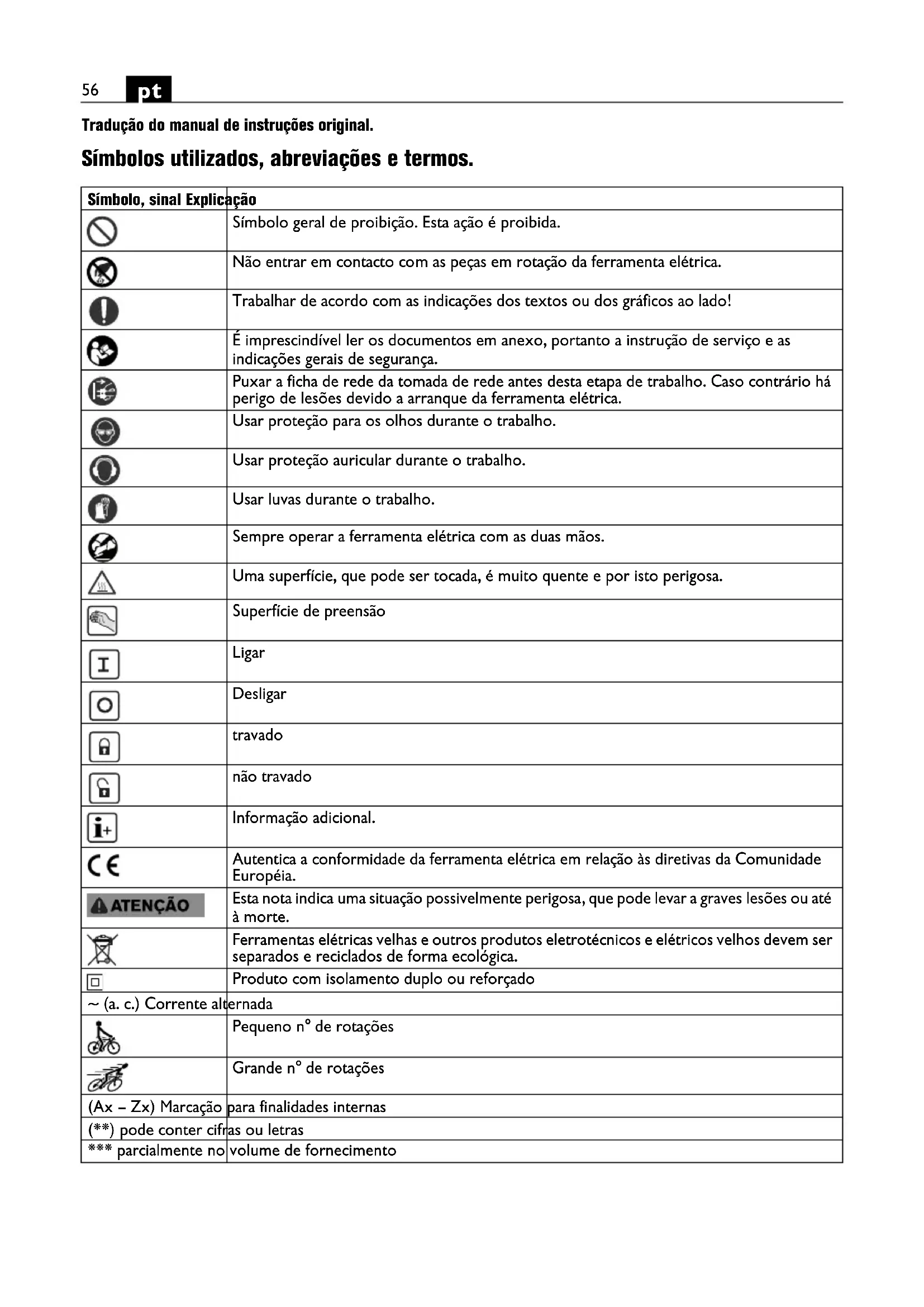 Tradução do manual de instruções original. Símbolos utilizados, abreviações e termos. Símbolo, sinal Explicação Símbolo geral de proibição. Esta ação é proibida. Não entrar em contacto com as peças em rotação da ferramenta elétrica. Trabalhar de acordo com as indicações dos textos ou dos gráficos ao lado! É imprescindível ler os documentos em anexo, portanto a instrução de serviço e as indicações gerais de segurança. Puxar a ficha de rede da tomada de rede antes desta etapa de trabalho. Caso contrário há perigo de lesões devido a arranque da ferramenta elétrica. Usar proteção para os olhos durante o trabalho. Usar proteção auricular durante o trabalho. Usar luvas durante o trabalho. Sempre operar a ferramenta elétrica com as duas mãos. Uma superfície, que pode ser tocada, é muito quente e por isto perigosa. Superfície de preensão Ligar Desligar travado não travado Informação adicional. Autentica a conformidade da ferramenta elétrica em relação às diretivas da Comunidade Européia. Esta nota indica uma situação possivelmente perigosa, que pode levar a graves lesões ou até à morte. Ferramentas elétricas velhas e outros produtos eletrotécnicos e elétricos velhos devem ser separados e reciclados de forma ecológica. Produto com isolamento duplo ou reforçado ~ (a. c.) Corrente alternada Pequeno n° de rotações Grande n° de rotações (Ax – Zx) Marcação para finalidades internas (**) pode conter cifras ou letras *** parcialmente no volume de fornecimento57