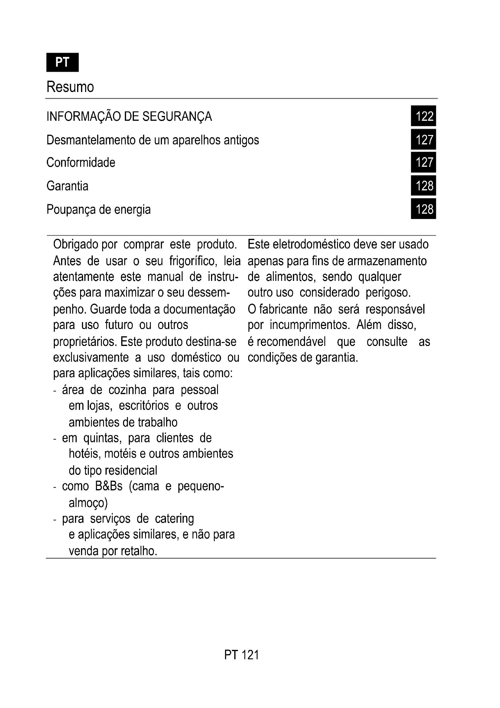 Obrigado por comprar este produto. Antes de usar o seu frigorífico, leia atentamente este manual de instru- ções para maximizar o seu dessem- penho. Guarde toda a documentação para uso futuro ou outros proprietários. Este produto destina-se exclusivamente a uso doméstico ou para aplicações similares, tais como: - área de cozinha para pessoal em lojas, escritórios e outros ambientes de trabalho - em quintas, para clientes de hotéis, motéis e outros ambientes do tipo residencial - como B&Bs (cama e pequeno- almoço) - para serviços de catering e aplicações similares, e não para venda por retalho. Este eletrodoméstico deve ser usado apenas para fins de armazenamento de alimentos, sendo qualquer outro uso considerado perigoso. O fabricante não será responsável por incumprimentos. Além disso, é recomendável que consulte as condições de garantia.PT 122