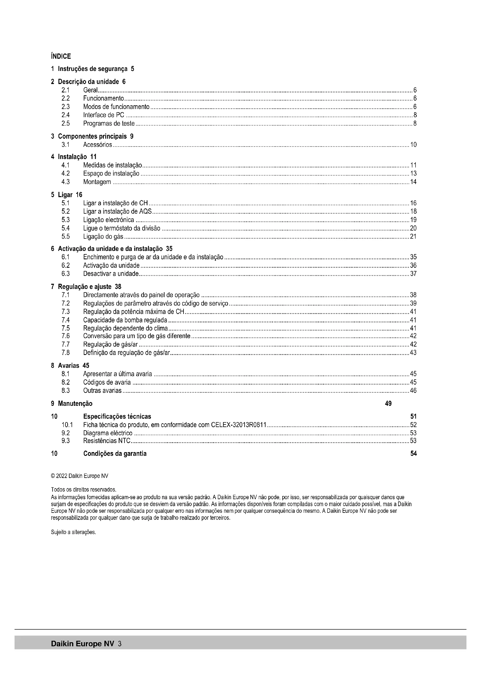 As condições gerais de garantia da Daikin Europe NV aplicam-se a este produto. A garantia é considerada nula se for determinado que as avarias, danos ou desgaste anómalo são devido a uma utilização incorrecta, tratamento inadequado ou reparação, regulação, instalação ou manutenção inadequada realizada por instaladores não certificados ou que foi exposto a substâncias com químicos agressivos (incluindo sprays para o cabelo) e outras substâncias prejudiciais. A garantia também se torna nula se forem aplicados na instalação tubos e acoplamentos que provoquem difusão de oxigénio, ou o defeito for uma consequência do calcário (prejudicial á unidade e instalação). Os danos à superfície, assim como os danos durante o transporte encontram-se ao abrigo da garantia. O direito à garantia é considerado nulo se não for possível provar que a caldeira de CH foi sujeita a manutenção por um instalador certificado pelo menos uma vez por ano a partir da data de activação. As instruções de instalação e utilização fornecidas com as unidades devem ser completamente respeitadas. Ambiente