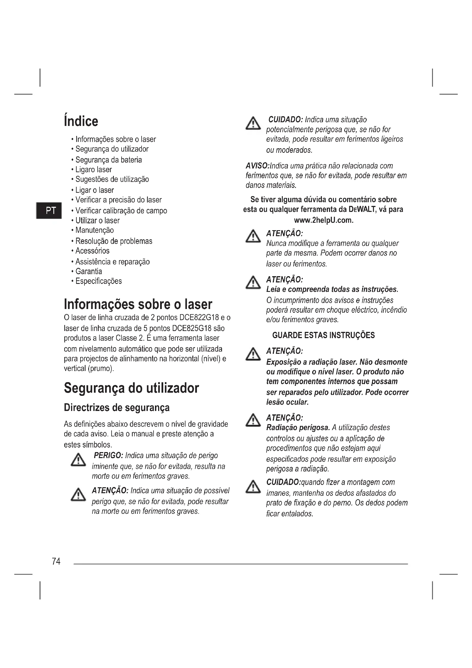 - Especicações Informações sobre o laser O laser de linha cruzada de 2 pontos DCE822G18 e o laser de linha cruzada de 5 pontos DCE825G18 são produtos a laser Classe 2. É uma ferramenta laser com nivelamento automático que pode ser utilizada para projectos de alinhamento na horizontal (nível) e vertical (prumo). Segurança do utilizador Directrizes de segurança As denições abaixo descrevem o nível de gravidade de cada aviso. Leia o manual e preste atenção a estes símbolos. PERIGO: Indica uma situação de perigo iminente que, se não for evitada, resulta na morte ou em ferimentos graves. ATENÇÃO: Indica uma situação de possível perigo que, se não for evitada, pode resultar na morte ou em ferimentos graves. CUIDADO: Indica uma situação potencialmente perigosa que, se não for evitada, pode resultar em ferimentos ligeiros ou moderados. AVISO:Indica uma prática não relacionada com ferimentos que, se não for evitada, pode resultar em danos materiais. Se tiver alguma dúvida ou comentário sobre esta ou qualquer ferramenta da DEWALT, vá para www.2helpU.com. ATENÇÃO: Nunca modique a ferramenta ou qualquer parte da mesma. Podem ocorrer danos no laser ou ferimentos. ATENÇÃO: Leia e compreenda todas as instruções. O incumprimento dos avisos e instruções poderá resultar em choque eléctrico, incêndio e/ou ferimentos graves.