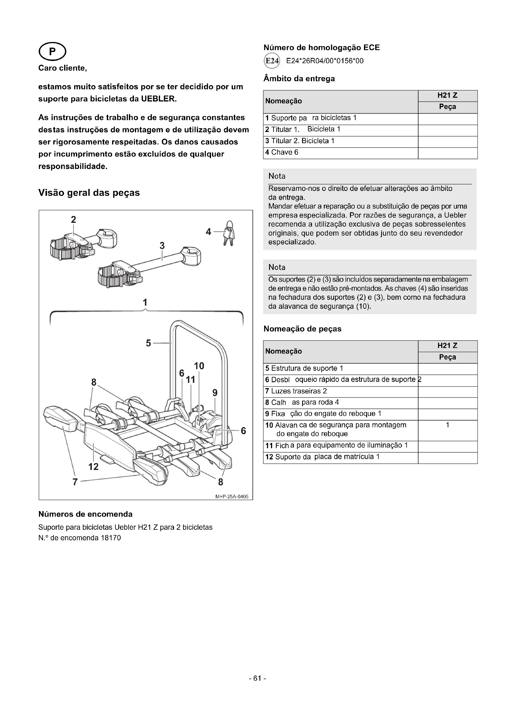 Caro cliente, estamos muito satisfeitos por se ter decidido por um sup orte para bicicletas da UEBLER. As instruções de trabalho e de segurança constantes des tas instruções de montagem e de utilização devem ser rigorosamente respeitadas. Os danos causados por incumprimento estão excluídos de qualquer res ponsabilidade. Visão geral das peças Números de encomenda Suporte para bicicletas Uebler H21 Z para 2 bicicletas N.º de encomenda 18170 Número de homologação ECE E24*26R04/00*0156*00 Âmbito da entrega Nomeação de peças