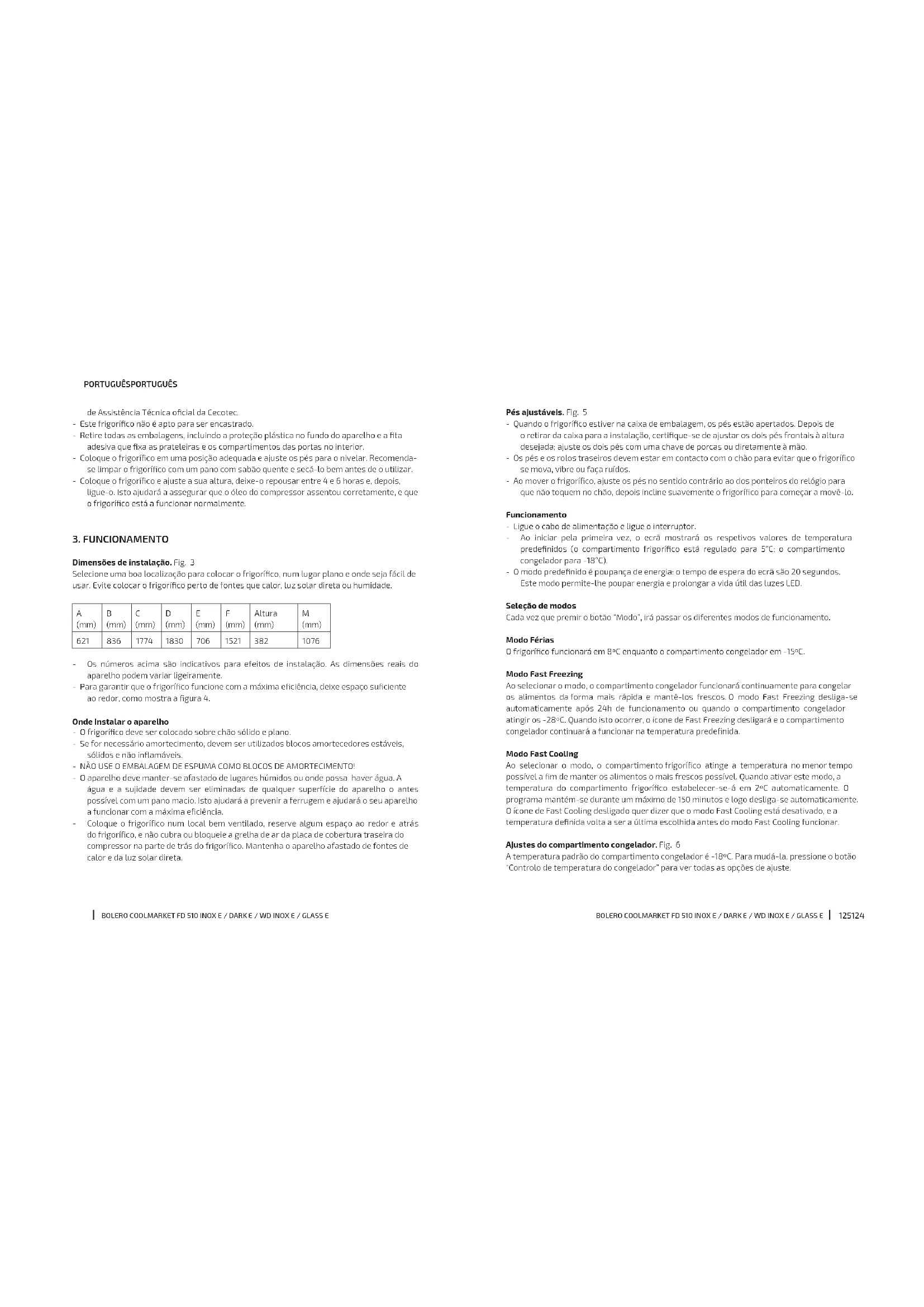 - Os números acima são indicativos para efeitos de instalação. As dimensões reais do aparelho podem variar ligeiramente. - Para garantir que o frigoríco funcione com a máxima eciência, deixe espaço suciente ao redor, como mostra a gura 4. Onde instalar o aparelho - O frigoríco deve ser colocado sobre chão sólido e plano. - Se for necessário amortecimento, devem ser utilizados blocos amortecedores estáveis, sólidos e não inamáveis. - NÃO USE O EMBALAGEM DE ESPUMA COMO BLOCOS DE AMORTECIMENTO! - O aparelho deve manter-se afastado de lugares húmidos ou onde possa haver água. A água e a sujidade devem ser eliminadas de qualquer superfície do aparelho o antes possível com um pano macio. Isto ajudará a prevenir a ferrugem e ajudará o seu aparelho a funcionar com a máxima eciência. - Coloque o frigoríco num local bem ventilado, reserve algum espaço ao redor e atrás do frigoríco, e não cubra ou bloqueie a grelha de ar da placa de cobertura traseira do compressor na parte de trás do frigoríco. Mantenha o aparelho afastado de fontes de calor e da luz solar direta.127126 BOLERO COOLMARKET FD 510 INOX E / DARK E / WD INOX E / GLASS E BOLERO COOLMARKET FD 510 INOX E / DARK E / WD INOX E / GLASS E