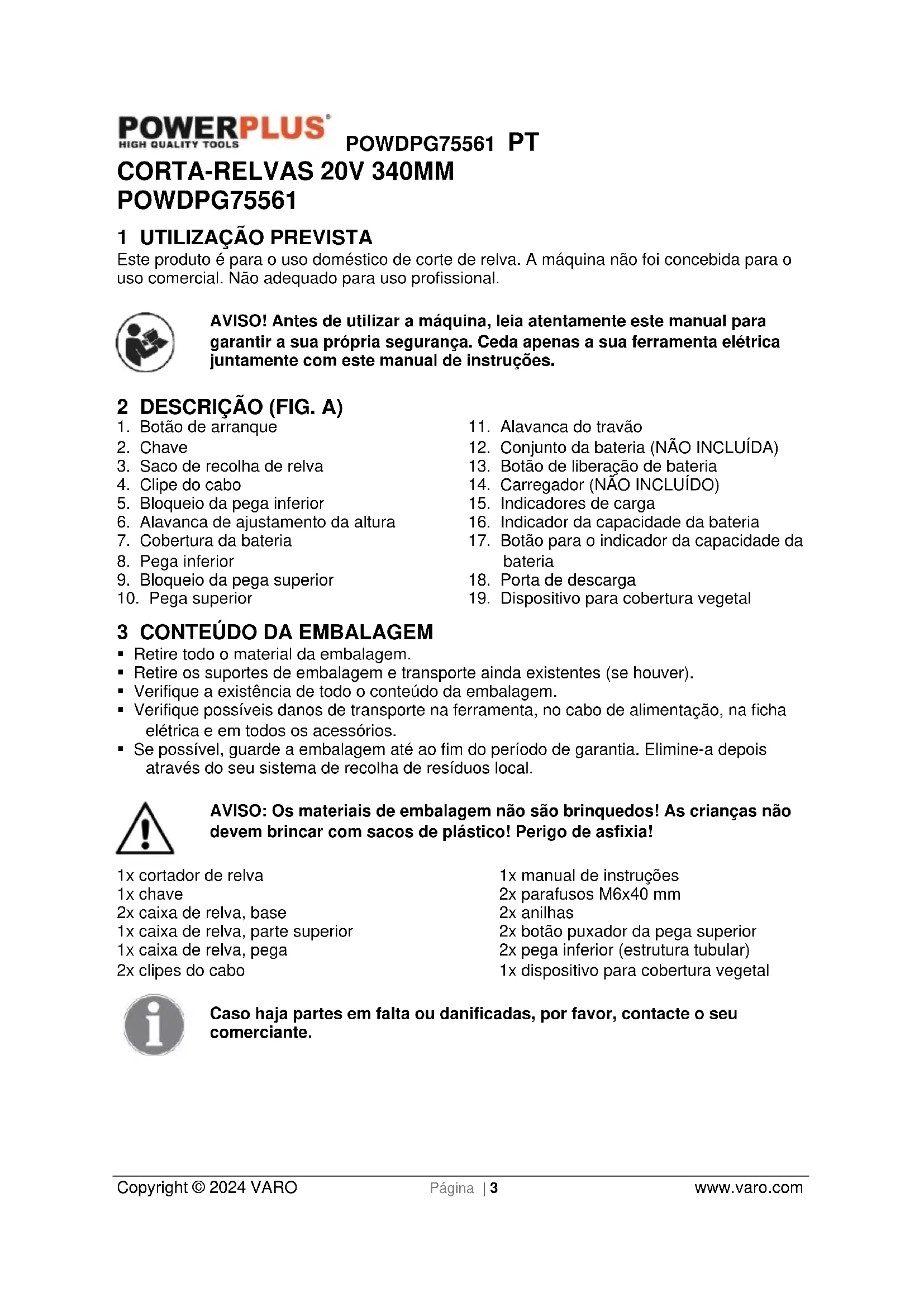 - Se possível, guarde a embalagem até ao fim do período de garantia. Elimine-a depois através do seu sistema de recolha de resíduos local. AVISO: Os materiais de embalagem não são brinquedos! As crianças não devem brincar com sacos de plástico! Perigo de asfixia! 1x cortador de relva 1x chave 2x caixa de relva, base 1x caixa de relva, parte superior 1x caixa de relva, pega 2x clipes do cabo 1x manual de instruções 2x parafusos M6x40 mm 2x anilhas 2x botão puxador da pega superior 2x pega inferior (estrutura tubular) 1x dispositivo para cobertura vegetal Caso haja partes em falta ou danificadas, por favor, contacte o seu comerciante.POWDPG75561 PT Copyright © 2024 VARO Página | 4 www.varo.com 4 SÍMBOLOS Neste manual e/ou na máquina são utilizados os seguintes símbolos:
