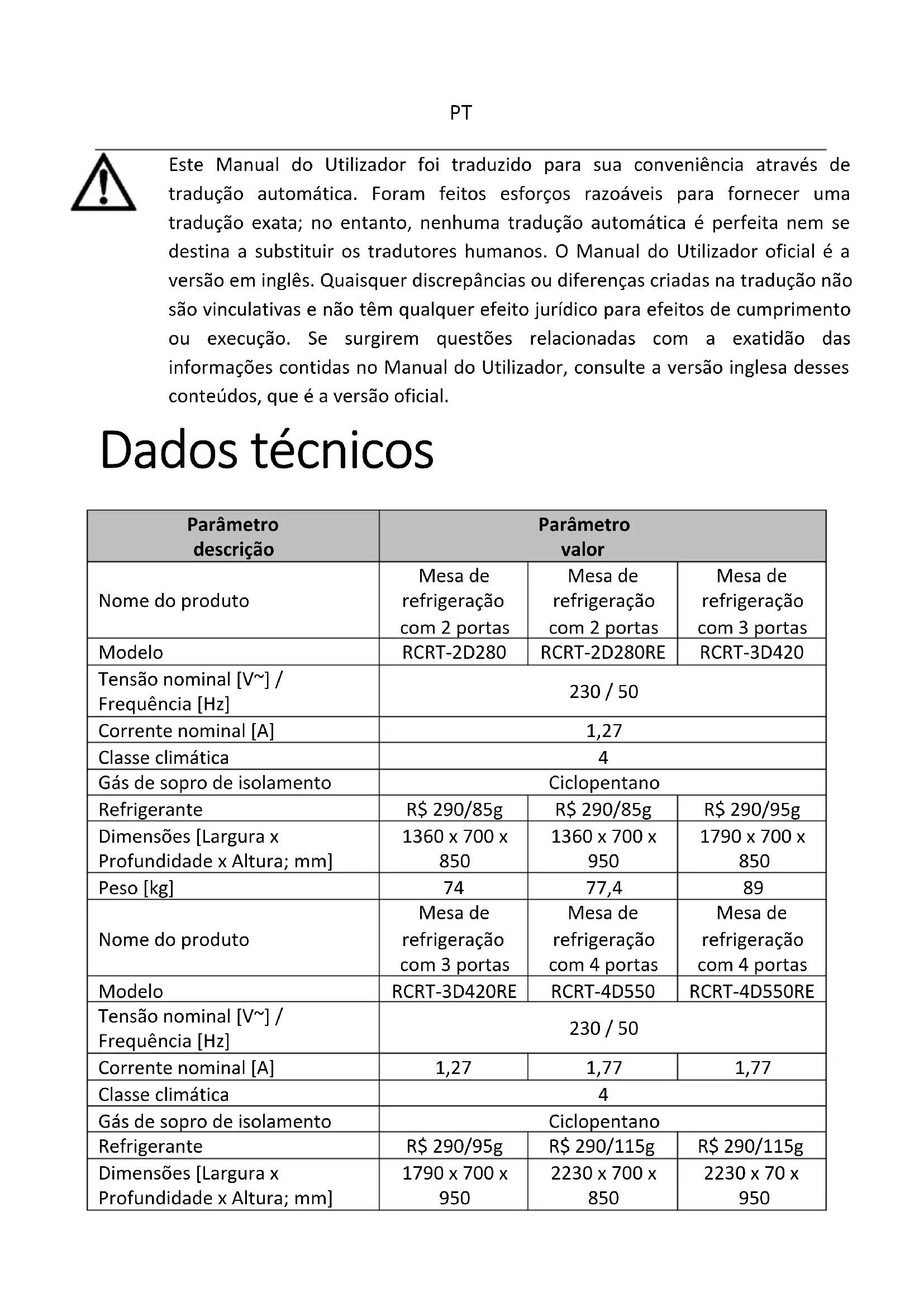 Este Manual do Utilizador foi traduzido para sua conveniência através de tradução automática. Foram feitos esforços razoáveis para fornecer uma tradução exata; no entanto, nenhuma tradução automática é perfeita nem se destina a substituir os tradutores humanos. O Manual do Utilizador oficial é a versão em inglês. Quaisquer discrepâncias ou diferenças criadas na tradução não são vinculativas e não têm qualquer efeito jurídico para efeitos de cumprimento ou execução. Se surgirem questões relacionadas com a exatidão das informações contidas no Manual do Utilizador, consulte a versão inglesa desses conteúdos, que é a versão oficial. Dados técnicos Parâmetro descrição Parâmetro valor Nome do produto Mesa de refrigeração com 2 portas Mesa de refrigeração com 2 portas Mesa de refrigeração com 3 portas Modelo RCRT-2D280