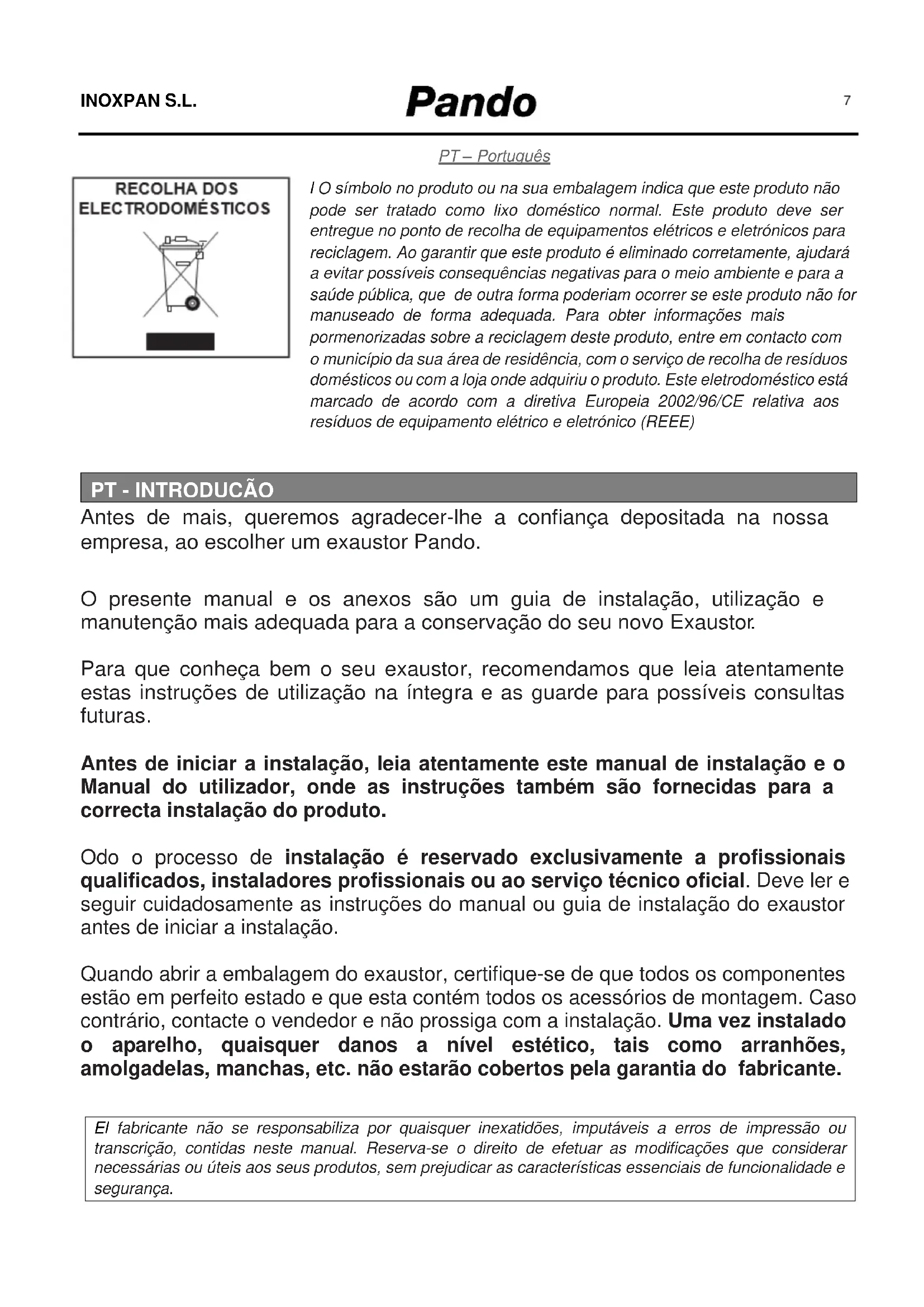 Antes de mais, queremos agradecer-lhe a confiança depositada na nossa empresa, ao escolher um exaustor Pando. O presente manual e os anexos são um guia de instalação, utilização e manutenção mais adequada para a conservação do seu novo Exaustor