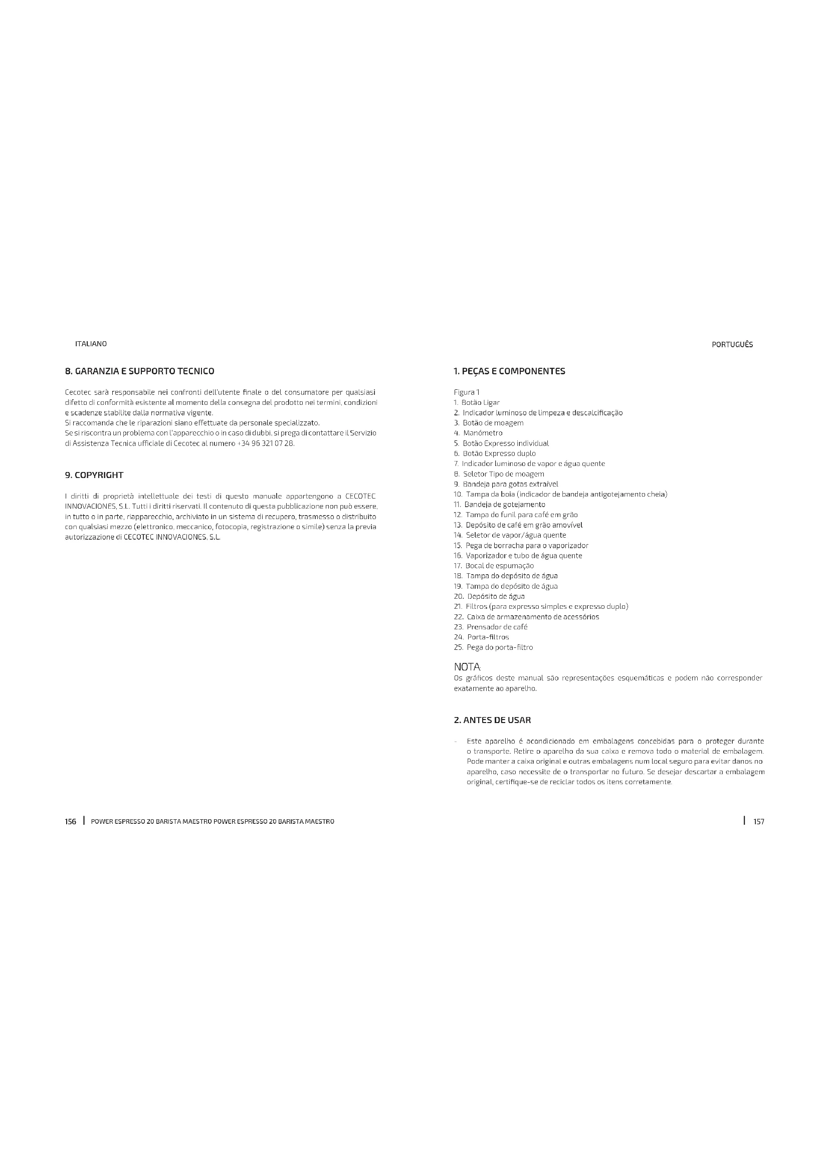 - Como ponto de partida para a extração de café expresso, experimente a moagem 5 ou superior. PASSO 6 Preparação da máquina de café antes da sua primeira utilização: - Encha o depósito de água. - Retire a tampa de silicone cor de laranja da parte inferior da válvula do depósito de água. - Abra a tampa e levante-a pela pega. - Encha o depósito de água. - Coloque a tampa do depósito de água e feche-a. NOTA: Certique-se de que o depósito de água está limpo e sem detritos, uma vez que quaisquer partículas nas podem bloquear o uxo de água. - Certique-se de que o seletor de vapor e de água quente está na posição vertical Desligado. - Ligue a cha a uma tomada de 220-240 V AC e ligue a máquina. - Pressione o botão Ligar para ligar a máquina de café. - O botão Ligar acender-se-á e os botões Moagem, Expresso simples e Expresso duplo piscarão para indicar que o thermoblock está a aquecer. NOTA: Quando o funil está instalado na posição correta, o botão Moagem acender-se-á completamente após a ligação. Se o funil estiver instalado na posição incorreta, o botão Moagem piscará rapidamente após a ligação. NOTA: Quando o botão Ligar, o botão Moagem, o botão Expresso simples e Expresso duplo estiverem completamente acesos, a máquina está pronta para executar todas as funções ou no estado READY. Verique a alimentação elétrica: - A cha é inserida na tomada. - O seletor de vapor e de água quente está na posição vertical Desligado. - Pressione o botão Ligar para ligar a máquina de café. - A máquina de café está ligada e no estado READY. Inserir o porta-ltro - Introduza o ltro de café simples ou duplo no porta-ltro. - Alinhe o porta-ltro com a posição INSERT à esquerda da cabeça de extração. - Insira o porta-ltro contra a cabeça de extração, rode lentamente o suporte do ltro em sentido horário até à posição central LOCK. NOTA: Pode ser difícil rodar o porta-ltro para a posição central devido à sua rigidez durante - Certique-se de que todas as peças e componentes estejam incluídos e em bom estado. Se algum deles faltar ou não estiver em boas condições, contactar imediatamente o Serviço de Assistência Técnica ocial da Cecotec. - Retire a tampa de silicone do depósito de água, se a máquina tiver uma, para facilitar o escoamento da água. - Limpe todas as peças amovíveis. PASSO 1 Retire a embalagem. Certique-se de que todas as embalagens foram retiradas e verique se todos os acessórios estão presentes. IMPORTANTE: Retire a tampa de silicone cor de laranja que se encontra no fundo do depósito de água. PASSO 2 Coloque a máquina de café. Certique-se de que a máquina de café é colocada numa mesa seca, estável, plana e horizontal. PASSO 3 - Lave e seque as peças listadas abaixo com água morna e um detergente suave: - Filtro para café simples de aço inoxidável - Filtro para café duplo de aço inoxidável - Depósito de água - Porta-ltros - Funil de café em grãos - Prensador de café - Enxague e seque ao ar. PASSO 4 - Coloque os acessórios. - Guarde os acessórios na caixa de armazenamento de acessórios atrás da bandeja antigotejamento. - Coloque a colher doseadora na bandeja aquece-chávenas. PASSO 5 - Instale o funil de café em grão. - Certique-se de que o fecho do funil está alinhado com a parte da frente do funil. - Empurre o funil ligeiramente para baixo, para dentro da máquina de café. - Rode o bloqueio do funil em sentido horário para bloquear o funil no lugar. - Isto abre a porta do funil, libertando os grãos de café para o moinho. - Encha o funil com grãos de café acabados de torrar, de torrefação média ou escura.POWER ESPRESSO 20 BARISTA MAESTRO POWER ESPRESSO 20 BARISTA MAESTRO