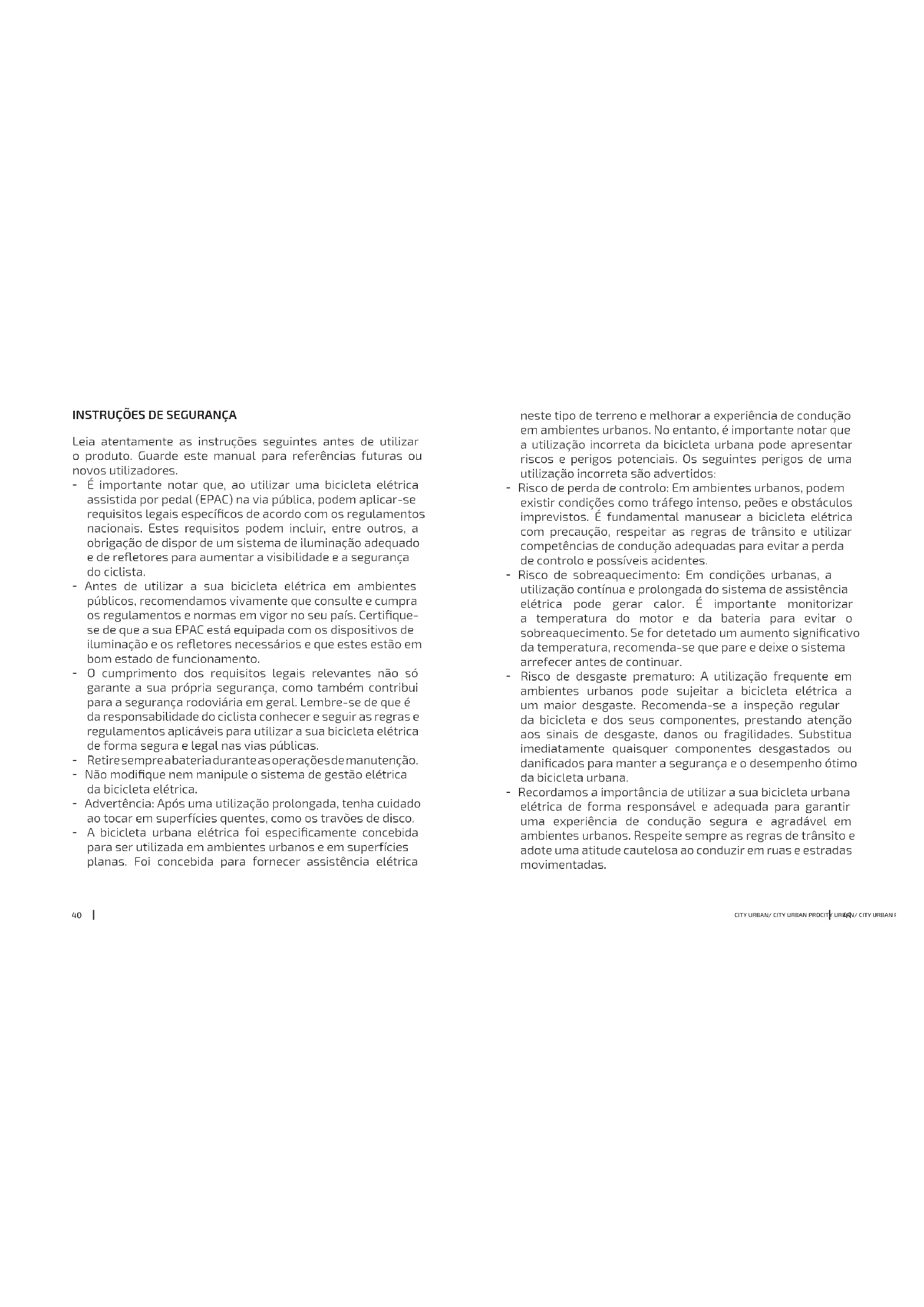 - Recomenda-se a utilização de um pano de algodão ou esponja húmida em vez de uma mangueira ou jato de água. - Recomenda-se a limpeza da bicicleta elétrica após cada utilização. No entanto, pode lavá- la semanalmente. Isto ajudará a prolongar a vida útil da bicicleta elétrica. - Utilize sabões e produtos de manutenção para bicicletas que não ataquem os plásticos e os vedantes, que podem ser encontrados em lojas especializadas. Também pode utilizarCITY URBAN/ CITY URBAN PROCITY URBAN/ CITY URBAN PRO