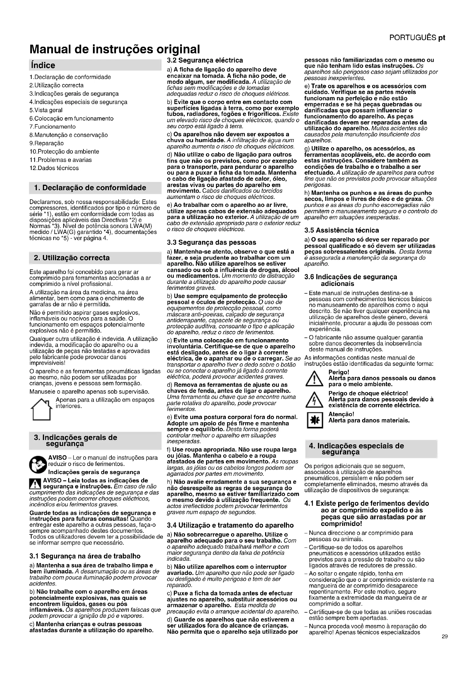 Manual de instruções original 1.Declaração de conformidade 2.Utilização correcta 3.Indicações gerais de segurança 4.Indicações especiais de segurança 5.Vista geral 6.Colocação em funcionamento 7.Funcionamento 8.Manutenção e conservação 9.Reparação 10.Protecção do ambiente 11.Problemas e avarias 12.Dados técnicos Declaramos, sob nossa responsabilidade: Estes compressores, identificados por tipo e número de série *1), estão em conformidade com todas as disposições aplicáveis das Directivas *2) e Normas *3). Nível de potência sonora LWA(M) medido / LWA(G) garantido *4), documentações técnicas no *5) - ver página 4. Este aparelho foi concebido para gerar ar comprimido para ferramentas accionadas a ar comprimido a nível profissional. A utilização na área da medicina, na área alimentar, bem como para o enchimento de garrafas de ar não é permitida. Não é permitido aspirar gases explosivos, inflamáveis ou nocivos para a saúde. O funcionamento em espaços potencialmente explosivos não é permitido. Qualquer outra utilização é indevida. A utilização indevida, a modificação do aparelho ou a utilização de peças não testadas e aprovadas pelo fabricante pode provocar danos imprevisíveis! O aparelho e as ferramentas pneumáticas ligadas ao mesmo, não podem ser utilizadas por crianças, jovens e pessoas sem formação. Manuseie o aparelho apenas sob supervisão. Apenas para a utilização em espaços interiores. AVISO – Ler o manual de instruções para reduzir o risco de ferimentos. Indicações gerais de segurança AVISO – Leia todas as indicações de segurança e instruções. Em caso de não cumprimento das indicações de segurança e das instruções podem ocorrer choques eléctricos, incêndios e/ou ferimentos graves. Guarde todas as indicações de segurança e instruções para futuras consultas! Quando entregar este aparelho a outras pessoas, faça-o sempre acompanhado destes documentos. Todos os utilizadores devem ter a possibilidade de se informar sempre que necessário.
