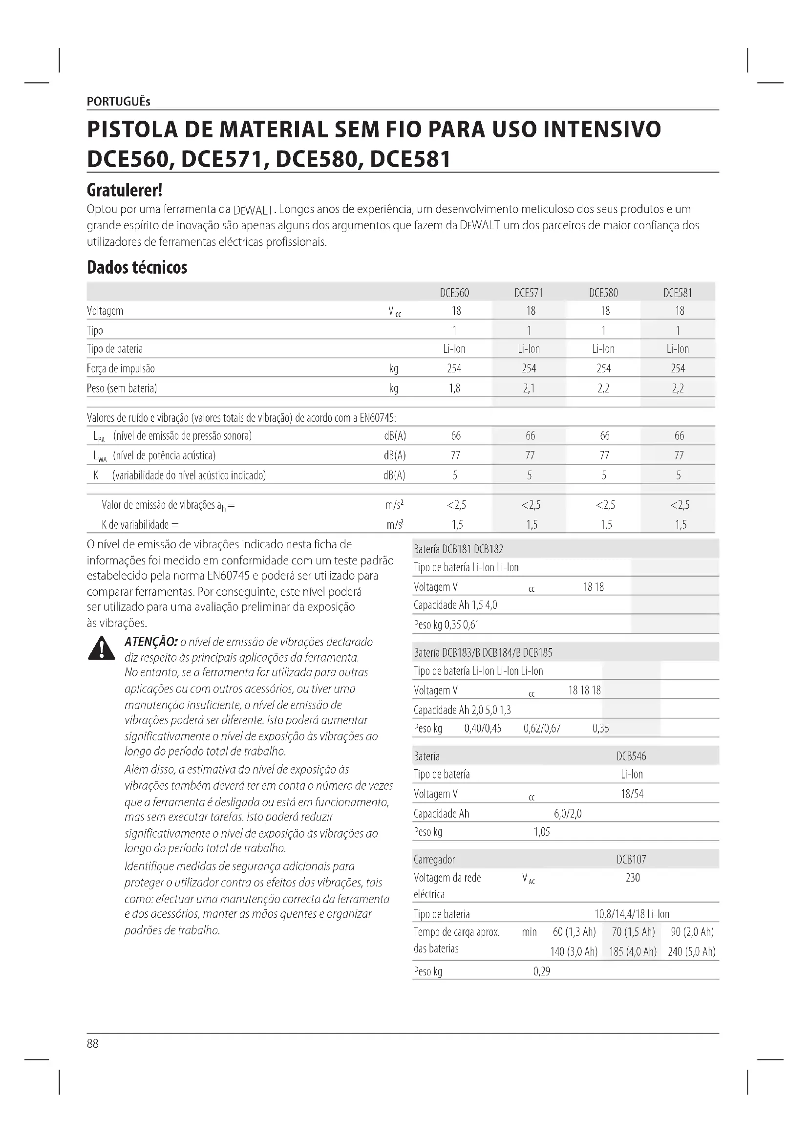 de 18V (modelos DCB181, DCB182, DCB183, DCB183B, DCB184, DCB184B, DCB185 e DCB546). Declaração de conformidade da CE Directiva “máquinas” Pistola de material sem fio para uso intensivo