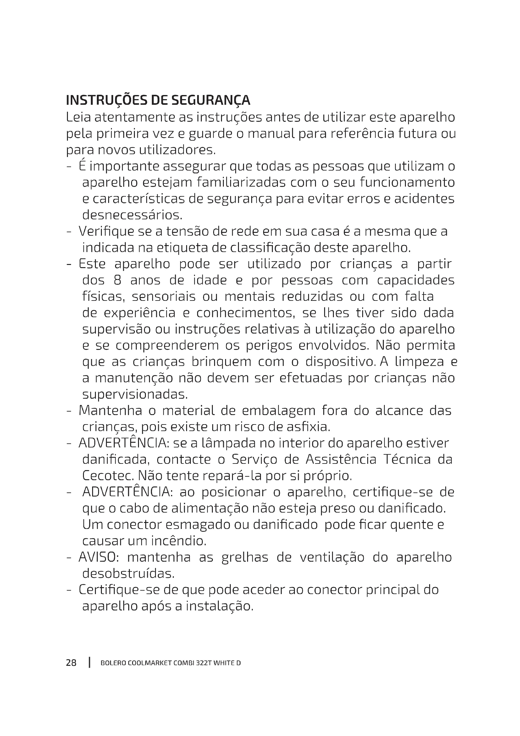 Encontre gratuitamente o manual do aparelho Bolero CoolMarket Combi 322T CECOTEC em formato PDF.