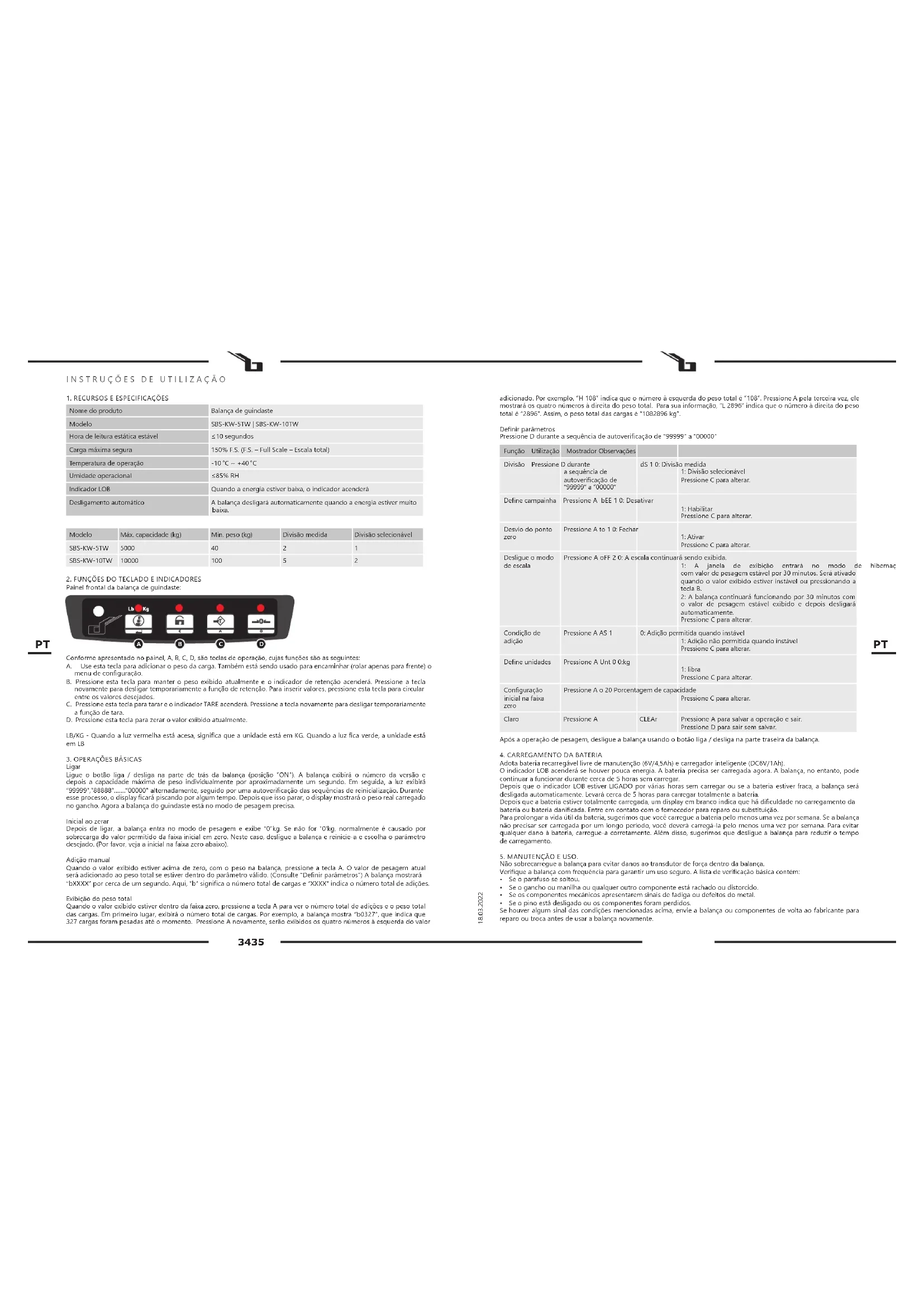 Notas gerais Depois de ligar a energia, se o display superior do dispositivo indicar que as baterias estão vazias, recarregue . Após alguns segundos, o controle remoto da balança de elevação será desligado automaticamente. Pontos de manutenção e segurança Evite colisões, chuva e umidade. Cair de altura danicaria gravemente o controle remoto sem o. Quando o dispositivo não for usado por um longo período, desligue-o através do interruptor na parte traseira do dispositivo. Faça isso para proteger a bateria. Se você usa o dispositivo diariamente, não há necessidade de usar o switch. MENSAGENS “AA-MM-DD” HH:MM:SS Se o dispositivo não receber o sinal de pesagem correto, verique a potência da extremidade da balança de elevação. “――OV――” Mostra sobrecarga. Se não houver peso na balança e o display ainda mostrar a mensagem de sobrecarga, o cabo de descida da célula de carga para o transmissor está conectado incorretamente ou até mesmo cortado. DC LL Após o autoteste de inicialização, se o dispositivo exibir a mensagem acima e o sinal de subtensão acender, ele será desligado automaticamente após dois segundos. Isso mostra que as baterias do instrumento portátil estão vazias e não podem ser usadas normalmente. Nesse caso, recarregue o dispositivo. Como funciona a balança de elevação Coloque as baterias na balança da talha e ligue a chave. A luz indicadora de trabalho acenderá, o que mostra que a balança está pronta para operação. Atenção: A balança desliga automaticamente após uma hora de inatividade. Para utilizá-lo novamente, ele deve ser desligado e ligado novamente através do switch. Funções de exibição: Após pressionar o botão “ON”, o dispositivo executará o autoteste. Assim que a fase de autoteste for concluída, o display mostrará o peso atual carregado na balança do guindaste Atenção:
