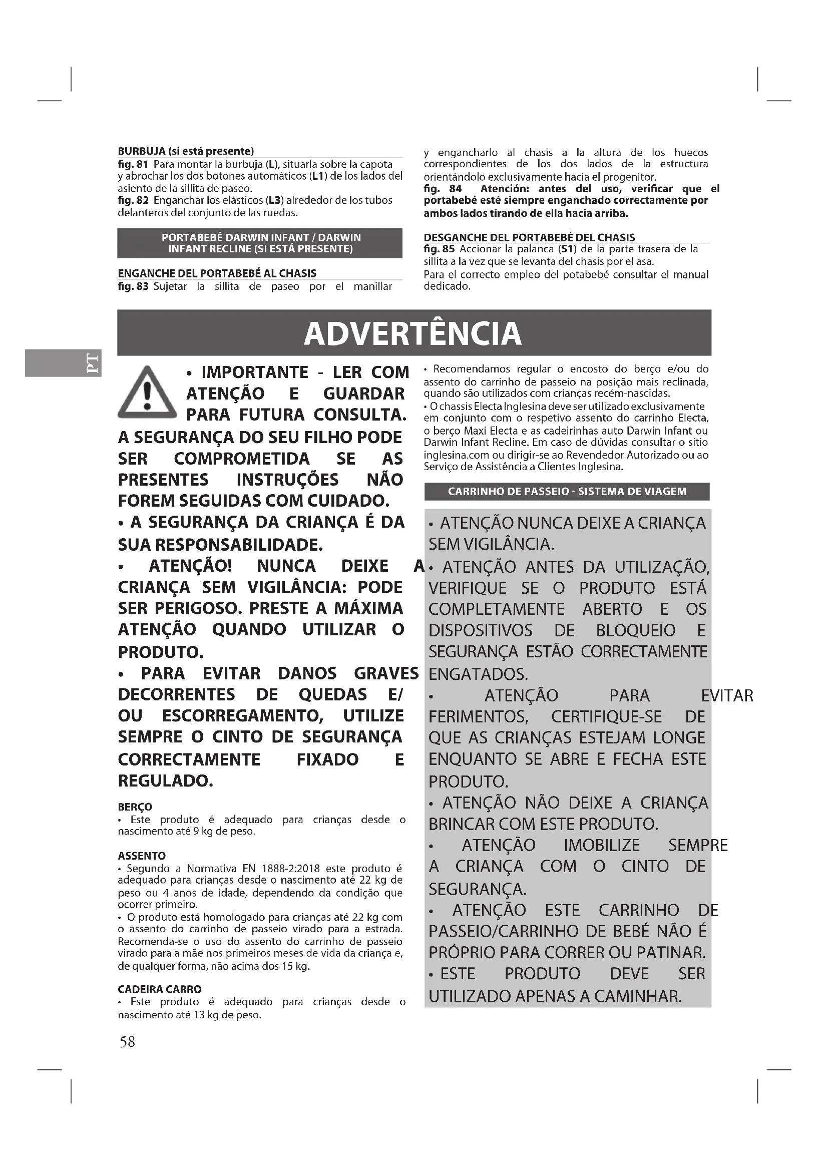 - O chassis Electa Inglesina deve ser utilizado exclusivamente em conjunto com o respetivo assento do carrinho Electa, o berço Maxi Electa e as cadeirinhas auto Darwin Infant ou Darwin Infant Recline. Em caso de dúvidas consultar o sítio inglesina.com ou dirigir-se ao Revendedor Autorizado ou ao Serviço de Assistência a Clientes Inglesina.