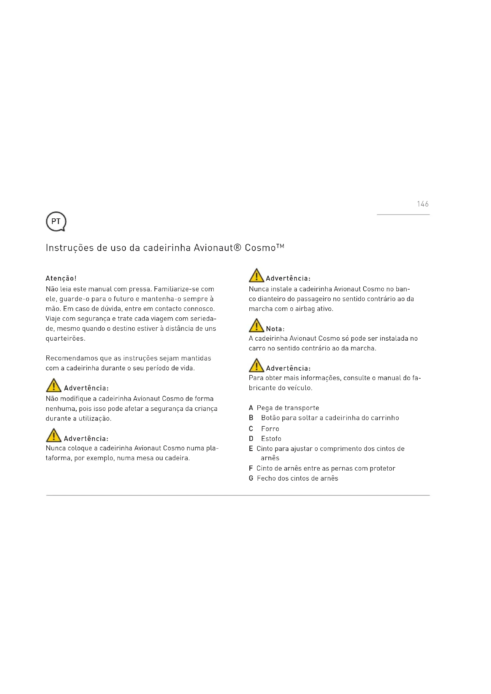 - Niniejsza gwarancja została przygotowana przez firmę Ł.KARWALA zarejestrowaną w Polsce. Adres firmy to: Szarlejka, ul. Łukaszewicza 172 42-130 Wręczyca Wielka, Polska (1) Zakupione produkty z usuniętymi albo zmienionymi etykietami lub numerami identyfikacyjnymi uważane są za nieautoryzowane. W związku z tym, że autentyczność takich produktów nie może być ustalona, gwarancja ich nie obejmuje. 145Atenção! Não leia este manual com pressa. Familiarize-se com ele, guarde-o para o futuro e mantenha-o sempre à mão. Em caso de dúvida, entre em contacto connosco. Viaje com segurança e trate cada viagem com serieda- de, mesmo quando o destino estiver à distância de uns quarteirões. Recomendamos que as instruções sejam mantidas com a cadeirinha durante o seu período de vida. Advertência: Não modifique a cadeirinha Avionaut Cosmo de forma nenhuma, pois isso pode afetar a segurança da criança durante a utilização. Advertência: Nunca coloque a cadeirinha Avionaut Cosmo numa pla- taforma, por exemplo, numa mesa ou cadeira. Instruções de uso da cadeirinha Avionaut® Cosmo™ Advertência: Nunca instale a cadeirinha Avionaut Cosmo no ban- co dianteiro do passageiro no sentido contrário ao da marcha com o airbag ativo. Nota: A cadeirinha Avionaut Cosmo só pode ser instalada no carro no sentido contrário ao da marcha. Advertência: Para obter mais informações, consulte o manual do fa- bricante do veículo. A Pega de transporte B Botão para soltar a cadeirinha do carrinho C Forro D Estofo E Cinto para ajustar o comprimento dos cintos de arnês F Cinto de arnês entre as pernas com protetor G Fecho dos cintos de arnês