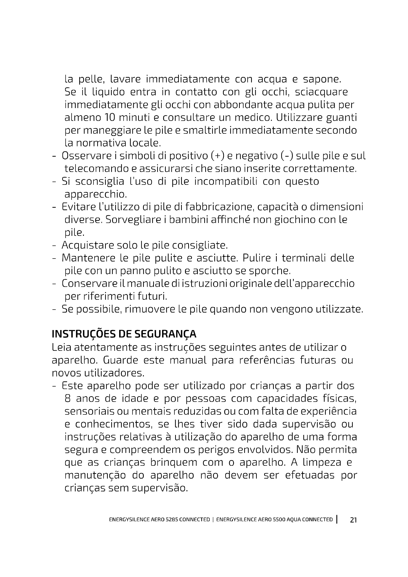 - O aparelho deve ser instalado de acordo com as normas nacionais de ligações elétricas. - Nunca instale o aparelho num espaço com elevada humidade. - Tenha muito cuidado se estiver perto das pás da ventoinha. - Para controlar a velocidade das pás da ventoinha, utilize os meios de controlo da velocidade proporcionados pela Cecotec. - Não dobre nem curve o sistema de agarre das pás durante a instalação nem durante a limpeza. - As tarefas de limpeza e manutenção do produto devem ser feitas de acordo com este manual para garantir o bom funcionamento do dispositivo. Desligue e desconecte o produto antes de limpar. - Assegure-se de que o aparelho não esteja colocado perto de cortinas ou outros objetos que possam car enredados. - Para a segurança das crianças, mantenha todo o material de embalagem (sacos de plástico, caixas, poliestireno, etc.) fora do seu alcance. - É recomendável que a montagem deste produto seja feita entre duas pessoas. - Este produto foi concebido para utilização em interiores. Instruções sobre as pilhas - Engolir as pilhas pode causar queimaduras, perfuração de tecido mole e morte. Pode causar queimaduras graves nas duas horas seguintes à sua ingestão. - Se as pilhas forem engolidas, procure prontamente cuidados médicos nas instalações médicas mais próximas. - Não permita que as crianças substituam pilhas sem a supervisão de adultos. - Não desmonte, abra ou destrua as pilhas. - Mantenha as crianças fora do alcance das pilhas. Mantenha24 ENERGYSILENCE AERO 5285 CONNECTED | ENERGYSILENCE AERO 5500 AQUA CONNECTED especialmente as pilhas pequenas fora do alcance das crianças. Em caso de ingestão de uma pilha, consulte imediatamente um médico. - Não exponha as pilhas ao calor ou ao fogo. Evite o armazenamento à luz solar direta. - Não curto-circuite um elemento ou uma pilha. Não guarde as pilhas ou baterias de forma desarrumada numa caixa ou gaveta onde possam entrar em curto-circuito ou ser curto- circuitadas por outros objetos metálicos. - Tanto as baterias como as pilhas podem apresentar fugas em condições extremas. No caso de uma fuga de bateria, não permita que o líquido entre em contacto com a pele ou os olhos. Se o líquido entrar em contacto com a pele, lave-se imediatamente com água e sabão. Se o líquido entrar em contacto com os olhos, lave imediatamente com água abundante durante no mínimo 10 minutos e procure assistência médica. Utilize luvas para manejar a pilha e deite-a fora imediatamente de acordo com a normativa local. - Observe as marcações positivas (+) e negativas (-) nas pilhas e na unidade de controlo e assegure-se de que são utilizadas corretamente. - Não utilize quaisquer pilhas que não tenham sido concebidas para utilização com o equipamento. - Não misturar pilhas de diferente fabrico, capacidade ou tamanho. A utilização de pilhas por crianças deve ser supervisionada. - Compre sempre as pilhas recomendadas. - Mantenha as pilhas limpas e secas. Limpe os terminais da bateria com um pano limpo e seco se carem sujos. - Guarde a documentação original do aparelho para referência futura.ENERGYSILENCE AERO 5285 CONNECTED | ENERGYSILENCE AERO 5500 AQUA CONNECTED