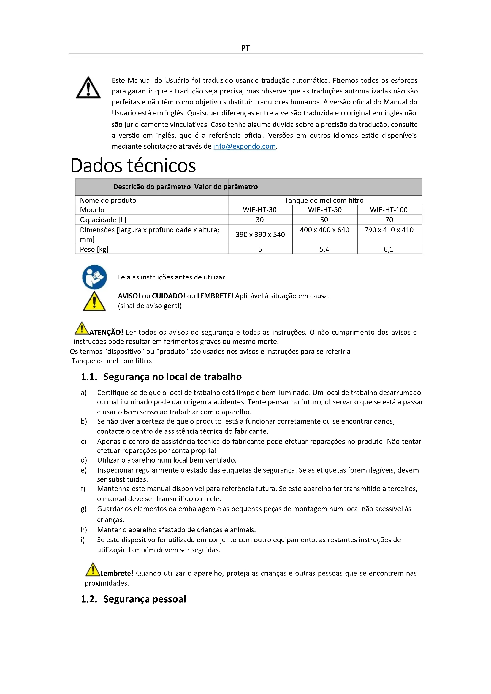 förtunningsmedel, bränsle, oljor eller andra kemiska ämnen eftersom det kan skada apparaten. KASSERING AV ANVÄNDA APPARATER: Släng inte apparaten i kommunala avfallssystem. Lämna den till en återvinnings- och insamlingsplats för elektriska och elektroniska apparater. Kontrollera symbolen på produkten, bruksanvisningen och förpackningen. Plasterna som använts för att konstruera apparaten kan återvinnas i överensstämmelse med deras märkning. Genom att välja att återvinna gör du en viktig insats för att skydda vår miljö. Kontakta lokala myndigheter för information om din lokala återvinningsanläggning.PT Este Manual do Usuário foi traduzido usando tradução automática. Fizemos todos os esforços para garantir que a tradução seja precisa, mas observe que as traduções automatizadas não são perfeitas e não têm como objetivo substituir tradutores humanos. A versão oficial do Manual do Usuário está em inglês. Quaisquer diferenças entre a versão traduzida e o original em inglês não são juridicamente vinculativas. Caso tenha alguma dúvida sobre a precisão da tradução, consulte a versão em inglês, que é a referência oficial. Versões em outros idiomas estão disponíveis mediante solicitação através de info@expondo.com. Dados técnicos Descrição do parâmetro Valor do parâmetro Nome do produto Tanque de mel com filtro Modelo WIE-HT-30 WIE-HT-50 WIE-HT-100 Capacidade [L]
