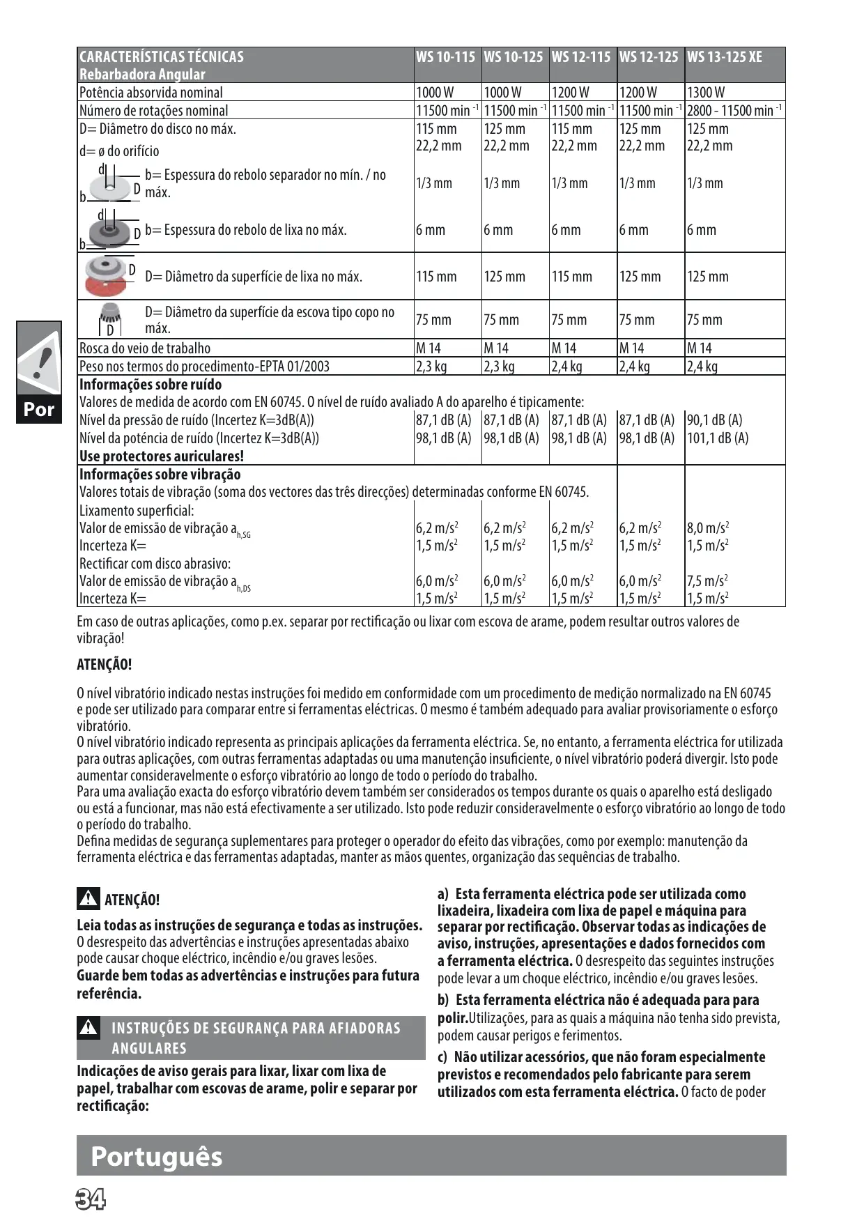 Rebarbadora Angular Potência absorvida nominal Número de rotações nominal D= Diâmetro do disco no máx. d= ø do orifício b= Espessura do rebolo separador no mín. / no máx. Por WS 10-115 WS 10-125 WS 12-115 WS 12-125 WS 13-125 XE 1000 W 1000 W 1200 W 1200 W 1300 W 11500 min -1 11500 min -1 11500 min -1 11500 min -1 2800 - 11500 min -1 115 mm 125 mm 115 mm 125 mm 125 mm 22,2 mm 22,2 mm 22,2 mm 22,2 mm 22,2 mm 1/3 mm 1/3 mm 1/3 mm 1/3 mm 1/3 mm b= Espessura do rebolo de lixa no máx. 6 mm 6 mm 6 mm 6 mm 6 mm D= Diâmetro da superfície de lixa no máx. 115 mm 125 mm 115 mm 125 mm 125 mm D= Diâmetro da superfície da escova tipo copo no 75 mm 75 mm 75 mm 75 mm 75 mm máx. Rosca do veio de trabalho M 14 M 14 M 14 M 14 M 14 Peso nos termos do procedimento-EPTA 01/2003 2,3 kg 2,3 kg 2,4 kg 2,4 kg 2,4 kg Informações sobre ruído Valores de medida de acordo com EN 60745. O nível de ruído avaliado A do aparelho é tipicamente: Nível da pressão de ruído (Incertez K=3dB(A)) 87,1 dB (A) 87,1 dB (A) 87,1 dB (A) 87,1 dB (A) 90,1 dB (A) Nível da poténcia de ruído (Incertez K=3dB(A)) 98,1 dB (A) 98,1 dB (A) 98,1 dB (A) 98,1 dB (A) 101,1 dB (A) Use protectores auriculares! Informações sobre vibração Valores totais de vibração (soma dos vectores das três direcções) determinadas conforme EN 60745. Lixamento superficial: Valor de emissão de vibração ah,SG 6,2 m/s2 6,2 m/s2 6,2 m/s2 6,2 m/s2 8,0 m/s2