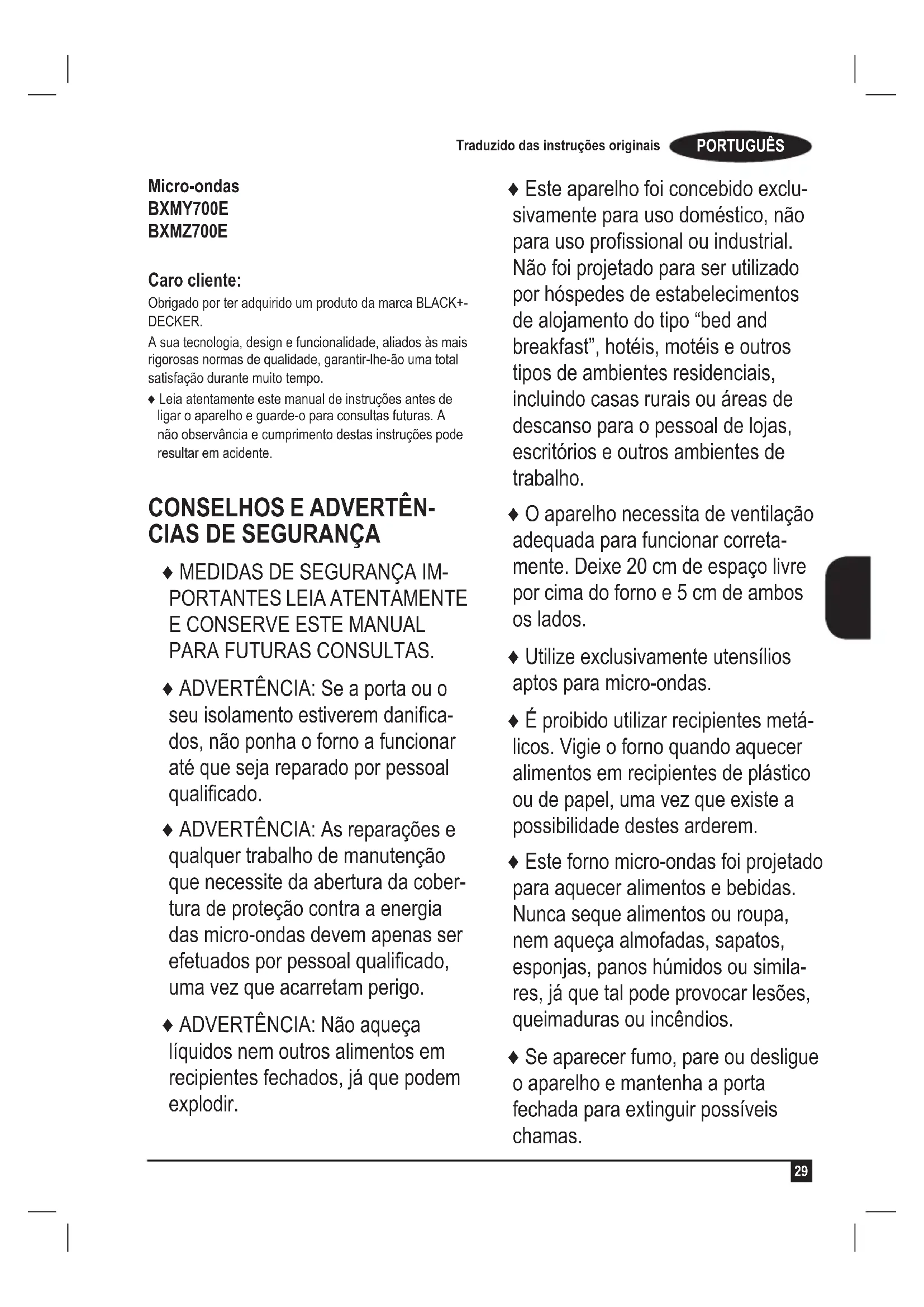 Micro-ondas BXMY700E BXMZ700E Caro cliente: Obrigado por ter adquirido um produto da marca BLACK+- DECKER. A sua tecnologia, design e funcionalidade, aliados às mais rigorosas normas de qualidade, garantir-lhe-ão uma total satisfação durante muito tempo. ♦ Leia atentamente este manual de instruções antes de ligar o aparelho e guarde-o para consultas futuras. A não observância e cumprimento destas instruções pode resultar em acidente.