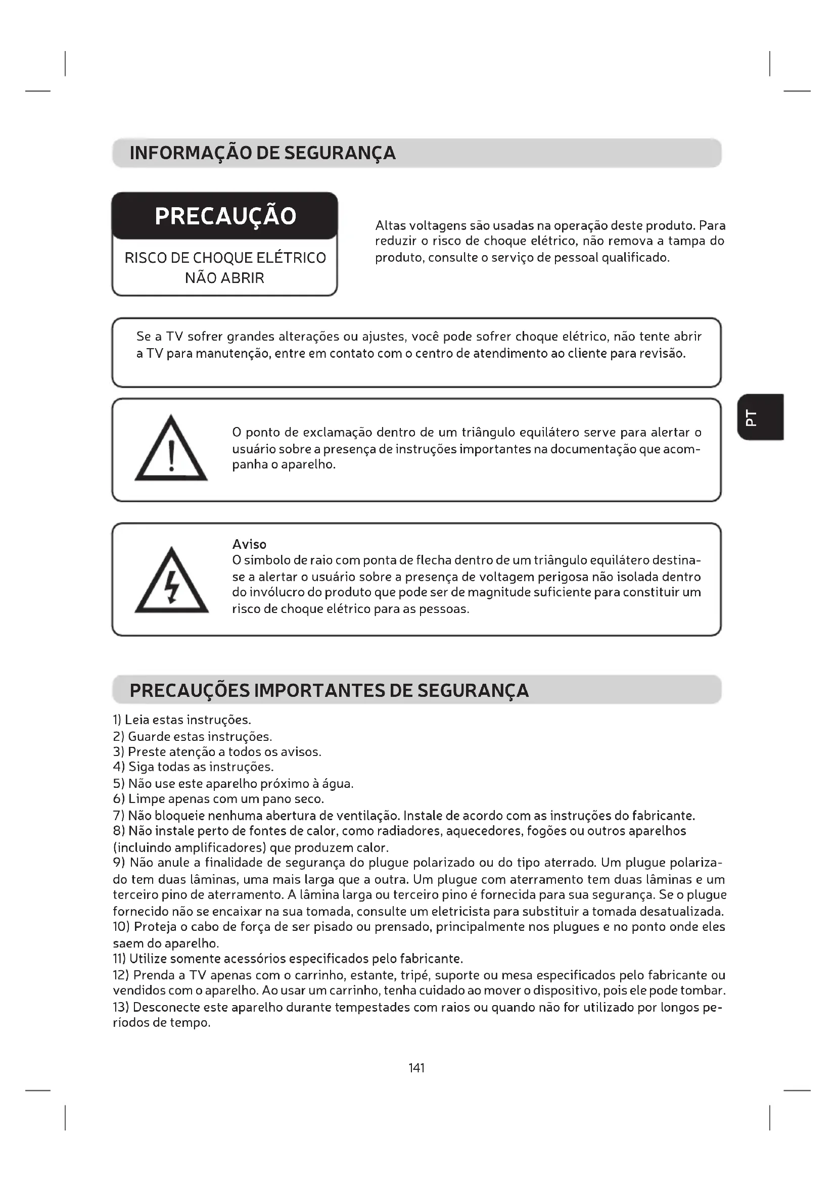 Altas voltagens são usadas na operação deste produto. Para reduzir o risco de choque elétrico, não remova a tampa do produto, consulte o serviço de pessoal qualiicado. Se a TV sofrer grandes alterações ou ajustes, você pode sofrer choque elétrico, não tente abrir a TV para manutenção, entre em contato com o centro de atendimento ao cliente para revisão. O ponto de exclamação dentro de um triângulo equilátero serve para alertar o usuário sobre a presença de instruções importantes na documentação que acom- panha o aparelho. Aviso O símbolo de raio com ponta de lecha dentro de um triângulo equilátero desina- se a alertar o usuário sobre a presença de voltagem perigosa não isolada dentro do invólucro do produto que pode ser de magnitude suiciente para consituir um risco de choque elétrico para as pessoas.