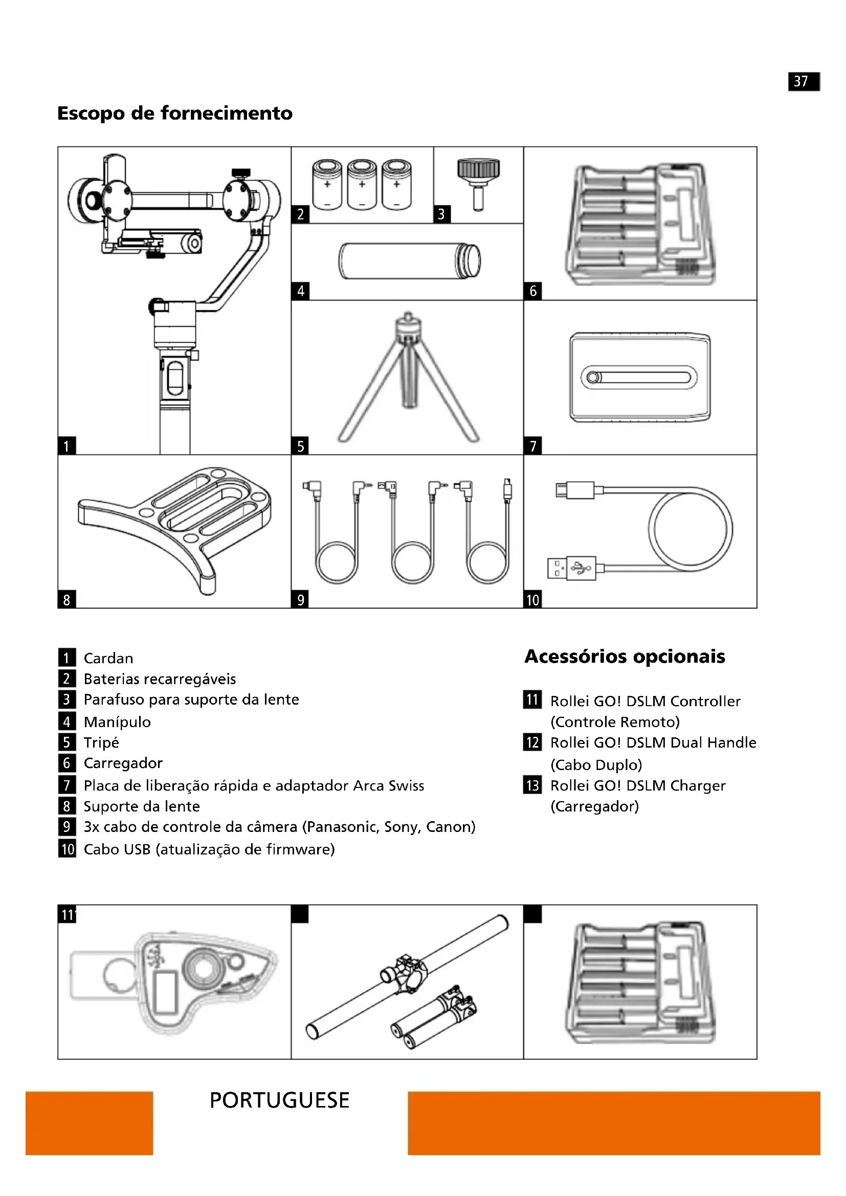 PORTUGUESE Visão geral da Rollei GO! DSLM Motor de inclinação Porta USB Placa de aperto rápido Rosca do parafuso de 1/4 polegada Entrada de 12 V CC Motor de rolamento Motor giratório Joystick Manípulo Saída 7.4 V DC Interface de controlo da câmara Placa de montagem da câmera Botão Ligar/Desligar / Visor LED Rosca do parafuso de 1/4 polegada