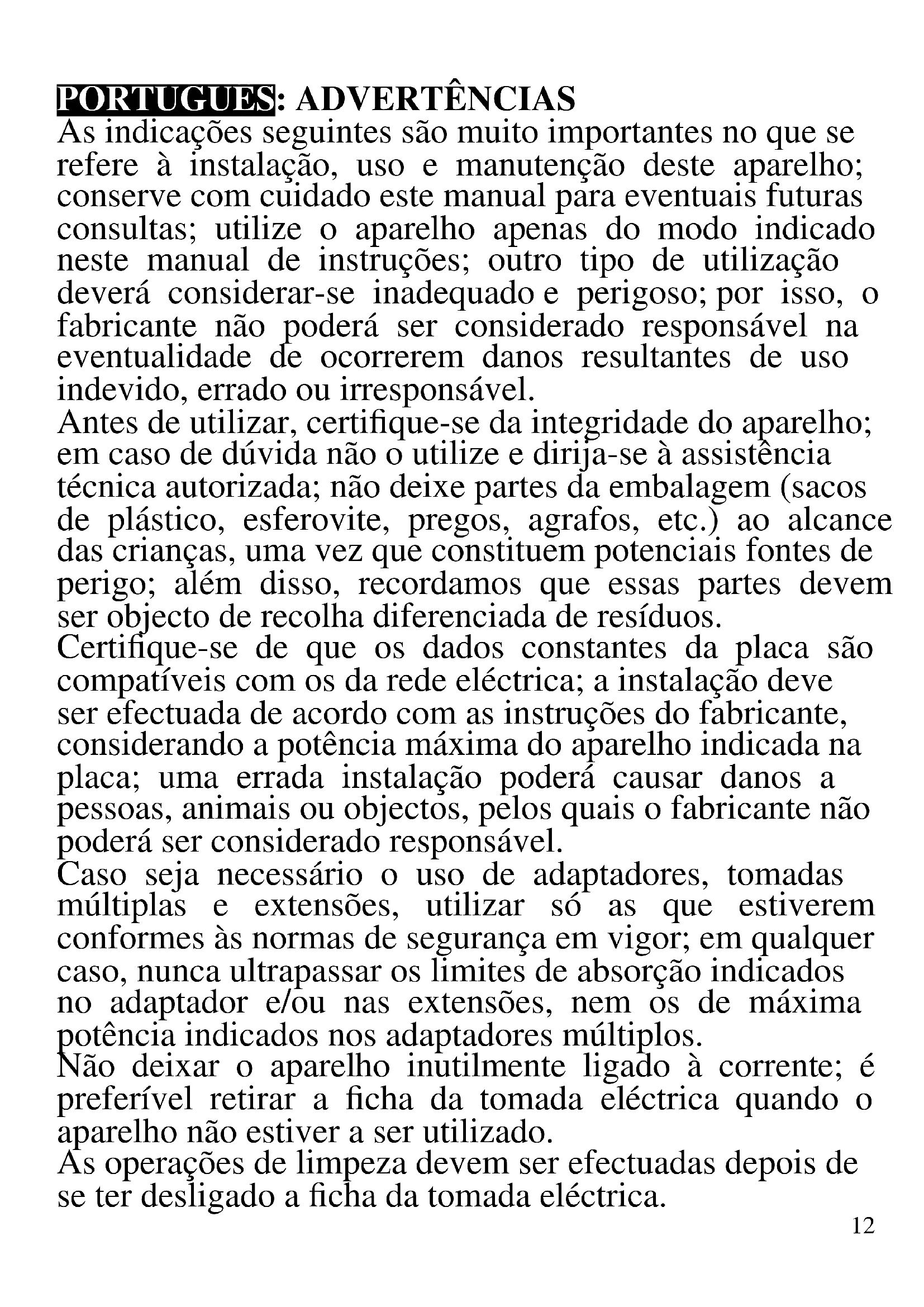 As indicações seguintes são muito importantes no que se refere à instalação, uso e manutenção deste aparelho; conserve com cuidado este manual para eventuais futuras consultas; utilize o aparelho apenas do modo indicado neste manual de instruções; outro tipo de utilização deverá considerar-se inadequado e perigoso; por isso, o fabricante não poderá ser considerado responsável na eventualidade de ocorrerem danos resultantes de uso indevido, errado ou irresponsável. Antes de utilizar, certifique-se da integridade do aparelho; em caso de dúvida não o utilize e dirija-se à assistência técnica autorizada; não deixe partes da embalagem (sacos de plástico, esferovite, pregos, agrafos, etc.) ao alcance das crianças, uma vez que constituem potenciais fontes de perigo; além disso, recordamos que essas partes devem ser objecto de recolha diferenciada de resíduos. Certifique-se de que os dados constantes da placa são compatíveis com os da rede eléctrica; a instalação deve ser efectuada de acordo com as instruções do fabricante, considerando a potência máxima do aparelho indicada na placa; uma errada instalação poderá causar danos a pessoas, animais ou objectos, pelos quais o fabricante não poderá ser considerado responsável. Caso seja necessário o uso de adaptadores, tomadas múltiplas e extensões, utilizar só as que estiverem conformes às normas de segurança em vigor; em qualquer caso, nunca ultrapassar os limites de absorção indicados no adaptador e/ou nas extensões, nem os de máxima potência indicados nos adaptadores múltiplos. Não deixar o aparelho inutilmente ligado à corrente; é preferível retirar a ficha da tomada eléctrica quando o aparelho não estiver a ser utilizado. As operações de limpeza devem ser efectuadas depois de se ter desligado a ficha da tomada eléctrica.13 Sempre desconecte o aparelho da fonte de alimentação se for deixado sem supervisão e antes de montá-lo e desmontá-lo. Sempre que o aparelho estiver fora de uso e seja decidido não o reparar, recomenda-se a sua inutilização, cortando-lhe o cabo de alimentação. - Antes de cada utilização, soltar o cabo de alimentação. Não aproximar o cabo de alimentação de objectos cortantes ou de superfícies quentes, e não o puxar para arrancar a ficha da tomada eléctrica. Não deixe que ele fique pendurado na bancada onde a criança pode segurá- lo. Não utilizar o aparelho no caso de o cabo de alimentação ou a ficha se encontrarem danificados, ou em caso de curto-circuitos; Nessa eventualidade, leve o aparelho a um centro de assistência autorizado. - Não manusear ou tocar o aparelho com as mãos molhadas ou os pés descalços. - Não expor o aparelho a condições atmosféricas adversas: chuva, humidade, gelo. Conserve-o em lugares secos. - Este aparelho não pode ser usado por crianças, mesmo com mais de 8 anos. Mantenha o aparelho e o cabo de alimentação fora do alcance de crianças. - Este aparelho pode ser por pessoas com reduzida capacidade física, sensorial ou mental, ou ainda com falta de experiência na sua utilização, desde que lhes seja assegurada uma adequada supervisão ou se tiverem sido instruídas no uso do aparelho em segurança. - As crianças não devem brincar com o aparelho. - Utilizar somente acessórios e componentes originais. - Não para uso comercial. Só para uso doméstico. Em caso de avaria e/ou de mau funcionamento, não intervenha sobre o aparelho. Para uma eventual reparação dirija-se unicamente a um centro autorizado pelo fabricante e solicite peças de substituição originais. A não observância destas indicações pode comprometer a segurança do aparelho e tornar inválida a garantia.14 ATENÇÃO: este aparelho inclui uma função de aquecimento. Algumas superfícies, mesmo que não a placa propriamente dita, poderão atingir temperaturas elevadas. Uma vez que a sensibilidade à temperatura difere de pessoa para pessoa, este aparelho deverá ser usado com CUIDADO. Coloque o aparelho exclusivamente sobre superfícies com aderência e preparadas para o efeito, e use as necessárias medidas de protecção contra o calor, como pegas ou luvas. - Este aparelho foi concebido para uso doméstico ou equivalente, em situações como as de refeitórios em pequenas empresas ou outros ambientes de natureza laboral; por clientes de hotéis, motéis ou acomodação turística, como turismo rural ou residencial. - Este aparelho não foi concebido para ser utilizado por intermédio de um temporizador externo ou de um sistema de comando à distância autónomo. Não sujeite produto a impactos, pois isso pode danificá-lo ATENÇÃO: durante o uso não cubra, não use tampas nem cozinhe em bandejas ou panelas