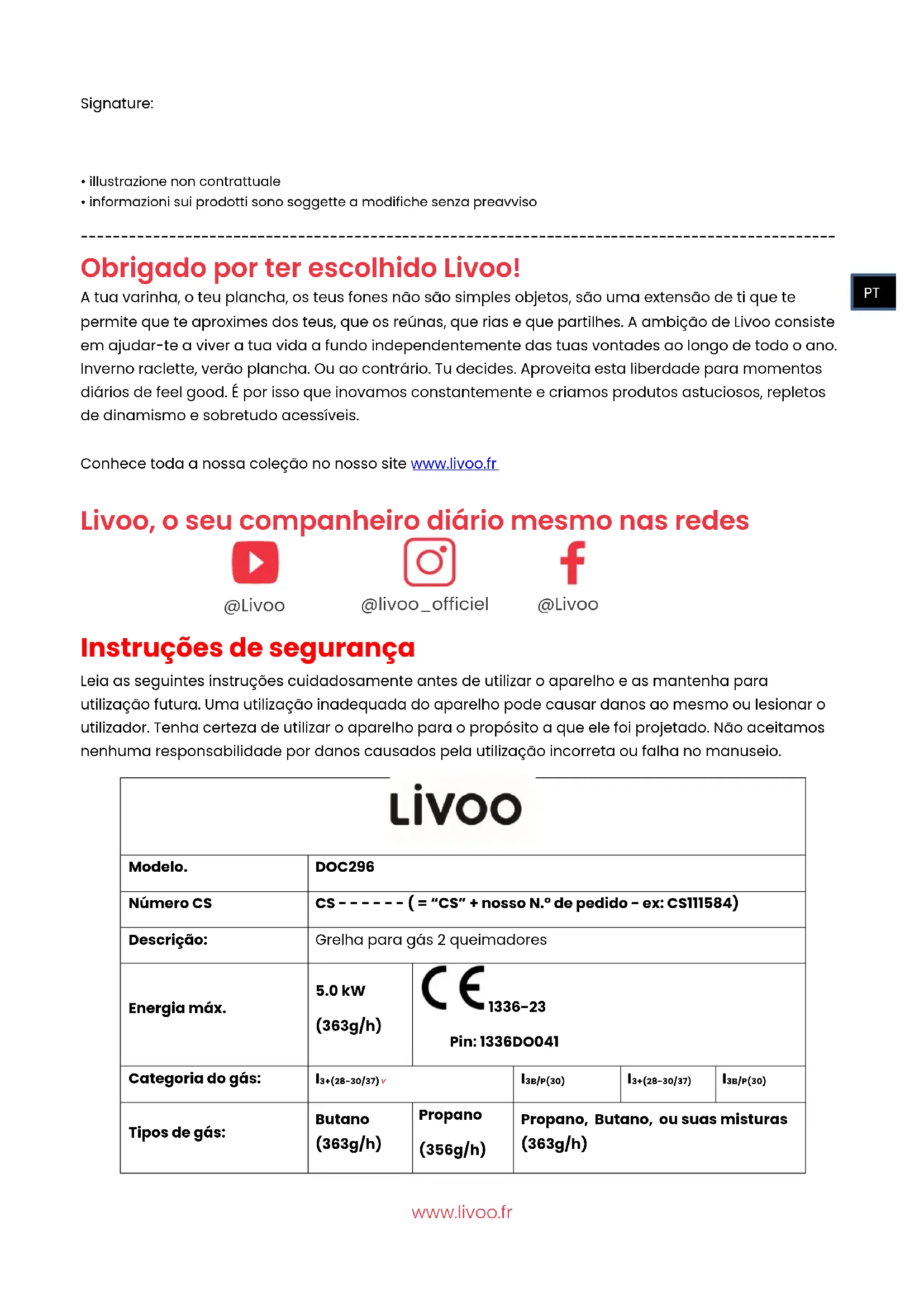 Obrigado por ter escolhido Livoo! A tua varinha, o teu plancha, os teus fones não são simples objetos, são uma extensão de ti que te permite que te aproximes dos teus, que os reúnas, que rias e que partilhes. A ambição de Livoo consiste em ajudar-te a viver a tua vida a fundo independentemente das tuas vontades ao longo de todo o ano. Inverno raclette, verão plancha. Ou ao contrário. Tu decides. Aproveita esta liberdade para momentos diários de feel good. É por isso que inovamos constantemente e criamos produtos astuciosos, repletos de dinamismo e sobretudo acessíveis. Conhece toda a nossa coleção no nosso site www.livoo.fr Livoo, o seu companheiro diário mesmo nas redes
