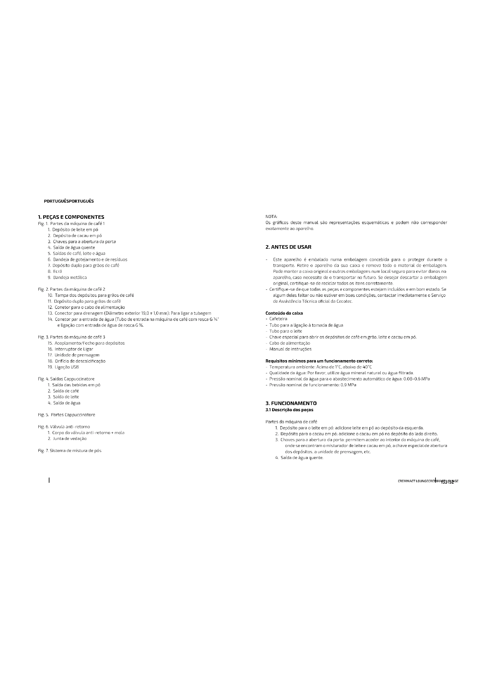 - Não adicione água ao depósito de café em grão. - Não retire a bandeja de gotejamento, o depósito de água ou qualquer outra peça enquanto a máquina estiver a funcionar. - Recomenda-se a utilização de grãos de café de torrefação média ou média-escura, não demasiado oleosos. O café torrado não deve ser utilizado. - Ao preparar uma bebida, não coloque a mão na saída da bebida; pode queimar-se. - Limpe a máquina com um pano húmido. Não utilize produtos abrasivos nem corrosivos. - Ao encher o depósito de grãos e os depósitos de solúveis, certique-se de que não ultrapassa a linha “MAX”. - Não desligue a máquina da corrente elétrica durante a preparação das bebidas, a limpeza automática ou o reinício. - Pode ajustar a altura da saída da bebida para corresponder à altura do copo da sua escolha e evitar salpicos. - Sempre que desligar a máquina, esvazie o depósito de borras de café e a água residual. - Não mergulhe a máquina de café em água para a limpar.CREMMAET LOUNGECREMMAET LOUNGE
