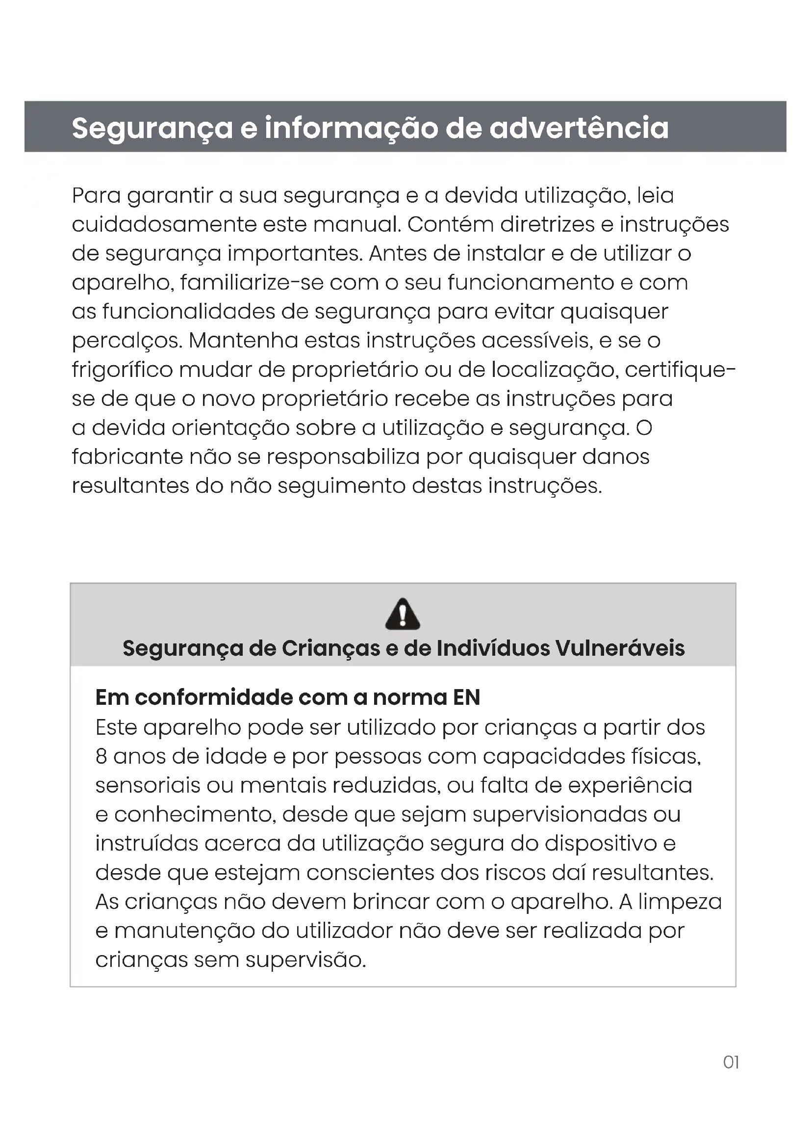 - Eliminação do aparelho Segurança e informação de advertência Para garantir a sua segurança e a devida utilização, leia cuidadosamente este manual. Contém diretrizes e instruções de segurança importantes. Antes de instalar e de utilizar o aparelho, familiarize-se com o seu funcionamento e com as funcionalidades de segurança para evitar quaisquer percalços. Mantenha estas instruções acessíveis, e se o frigorífico mudar de proprietário ou de localização, certifique- se de que o novo proprietário recebe as instruções para a devida orientação sobre a utilização e segurança. O fabricante não se responsabiliza por quaisquer danos resultantes do não seguimento destas instruções. Segurança de Crianças e de Indivíduos Vulneráveis Em conformidade com a norma EN Este aparelho pode ser utilizado por crianças a partir dos 8 anos de idade e por pessoas com capacidades físicas, sensoriais ou mentais reduzidas, ou falta de experiência e conhecimento, desde que sejam supervisionadas ou instruídas acerca da utilização segura do dispositivo e desde que estejam conscientes dos riscos daí resultantes. As crianças não devem brincar com o aparelho. A limpeza e manutenção do utilizador não deve ser realizada por crianças sem supervisão.02 Segurança de Crianças e de Indivíduos Vulneráveis Em conformidade com a norma IEC Este aparelho não se destina a ser utilizado por pessoas (incluindo crianças) com capacidades físicas, sensoriais ou mentais reduzidas, ou falta de experiência e conhecimento, exceto se forem supervisionadas ou instruídas acerca da utilização do aparelho por uma pessoa responsável pela sua segurança. Guarde todos os materiais da embalagem afastados das crianças para evitar riscos de asfixia. Quando elimina o aparelho, desligue da corrente, corte o cabo elétrico perto do aparelho, e remova a porta, para evitar perigos de choque elétrico ou de aprisionamento para crianças. Quando troca um aparelho usado, certifique-se de que o trinco ou o fecho de mola, se existir, é inutilizado para evitar o aprisionamento acidental. Segurança e informação de advertência03 Segurança e informação de advertência Segurança geral p. 3501