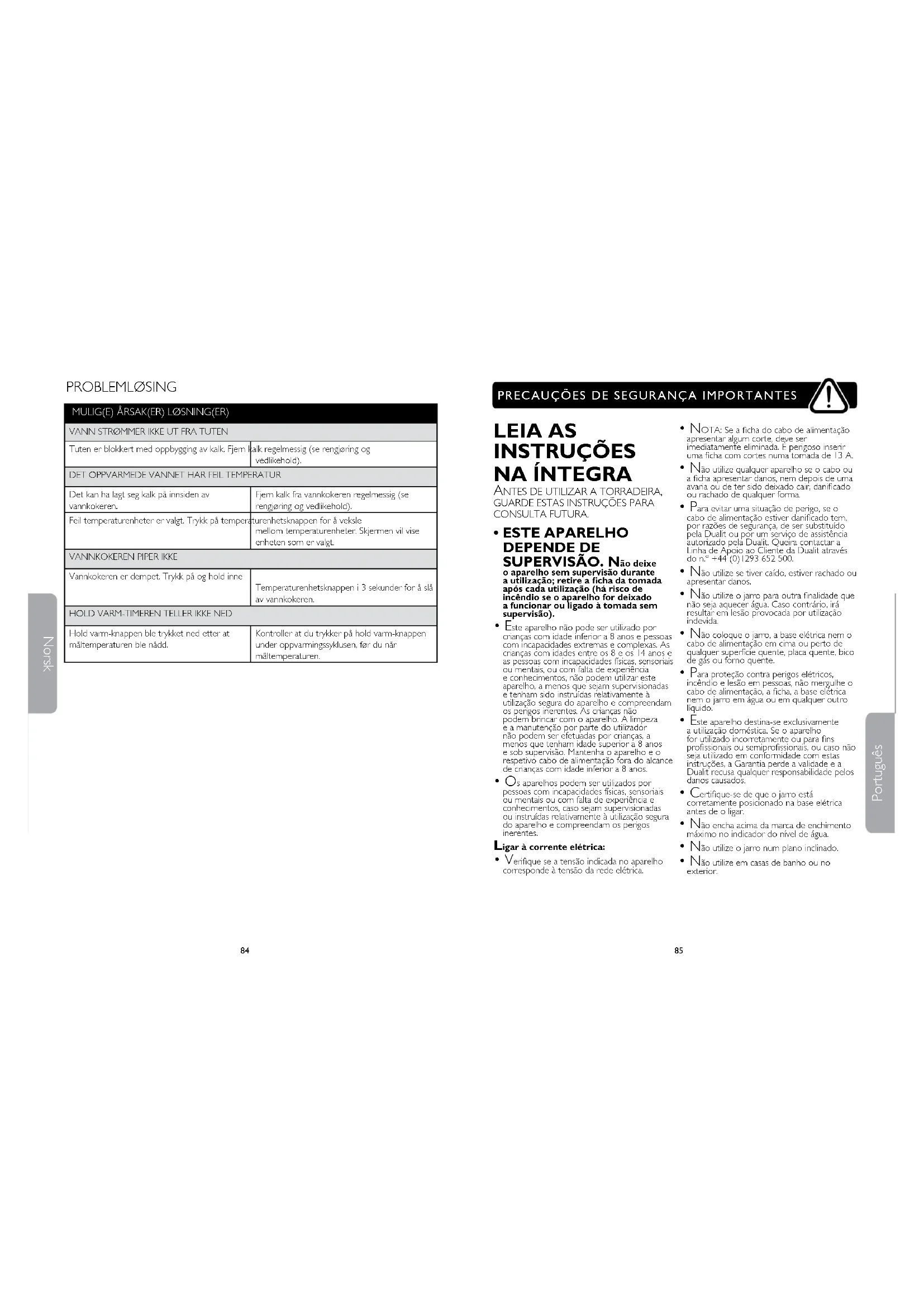 - Para evitar uma situação de perigo, se o cabo de alimentação estiver danicado tem, por razões de segurança, de ser substituído pela Dualit ou por um serviço de assistência autorizado pela Dualit. Queira contactar a Linha de Apoio ao Cliente da Dualit através do n.º +44 (0)1293 652 500.
